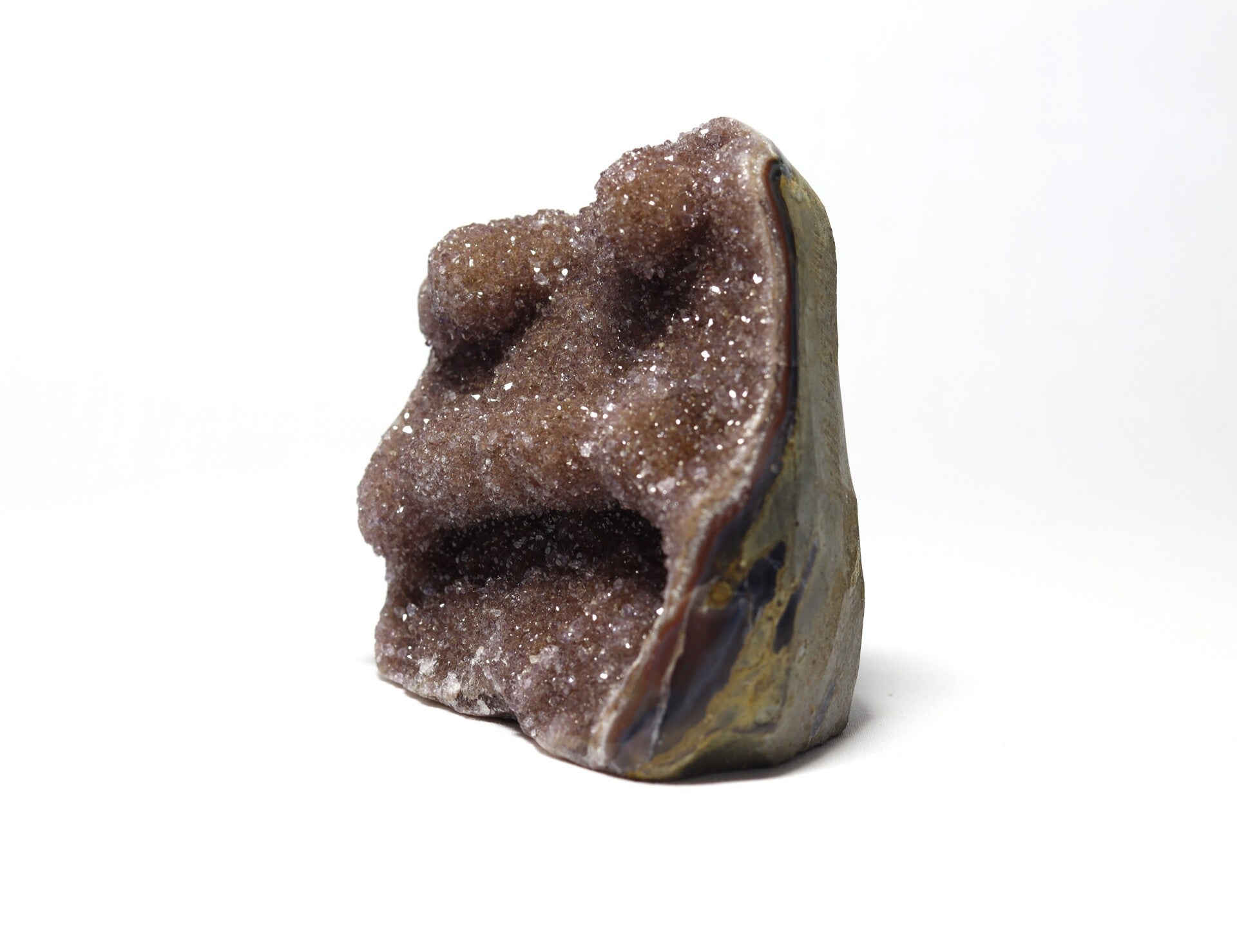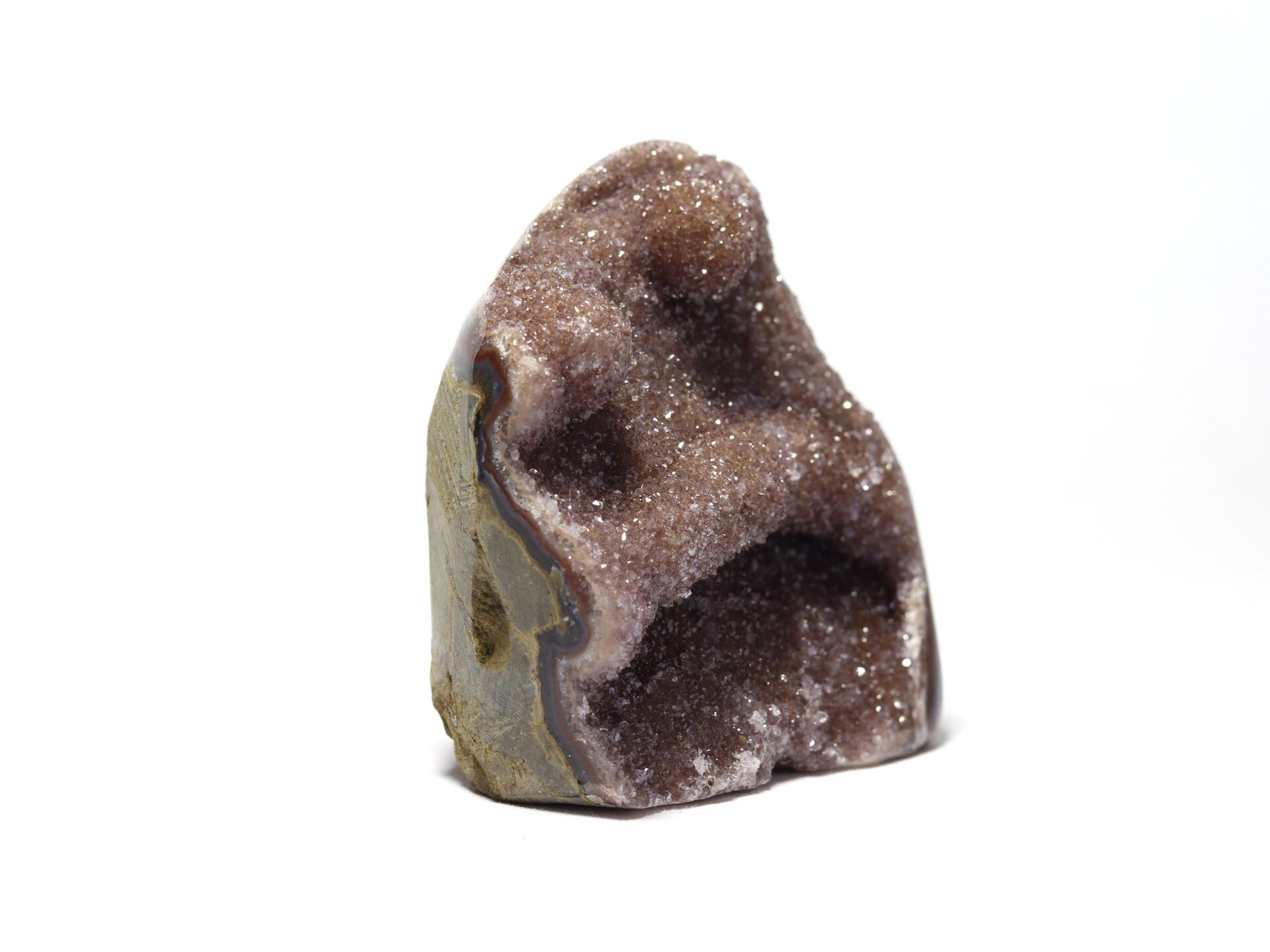 Vorming: Regenboog amethist vormt zich in geoden binnen vulkanische gesteenten, waar siliciumrijke oplossingen langzaam kristalliseren in holtes van basalt.
