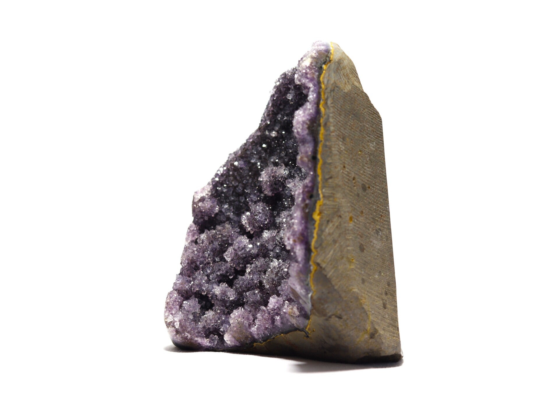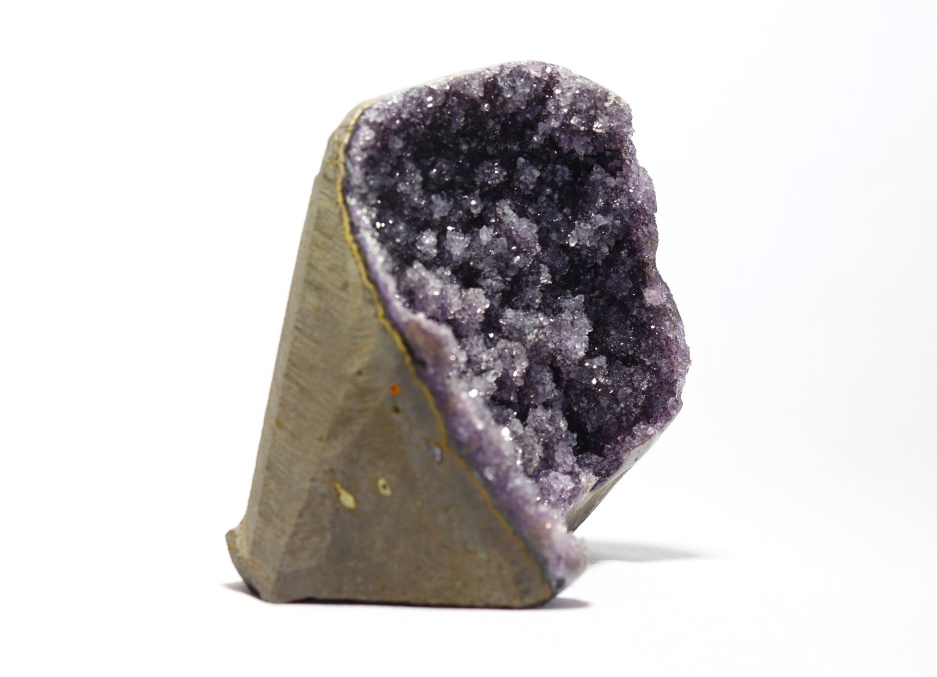 Vorming: Regenboog amethist vormt zich in geoden binnen vulkanische gesteenten, waar siliciumrijke oplossingen langzaam kristalliseren in holtes van basalt.