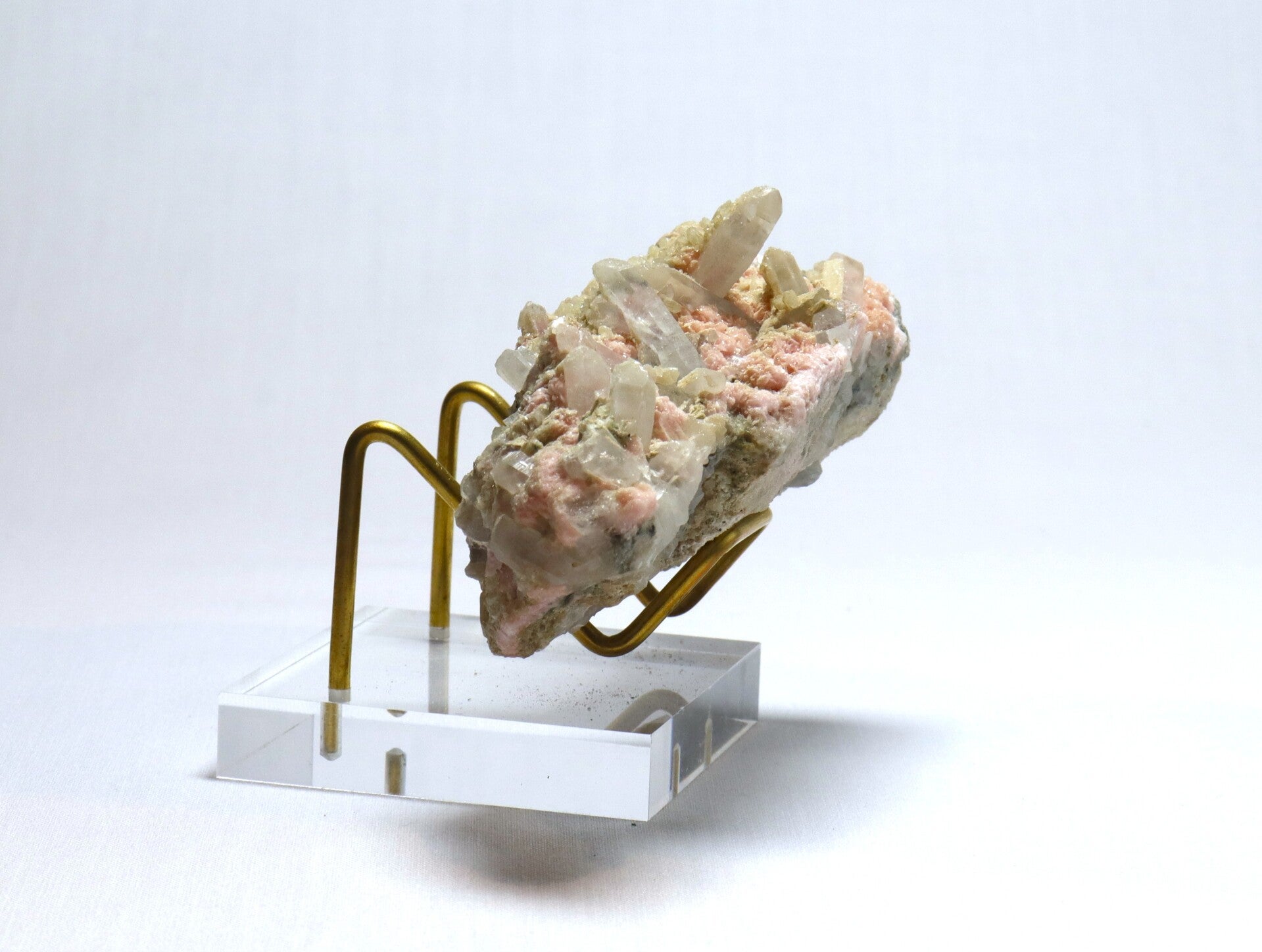 Rhodochrosiet met stilbiet en kwarts is een prachtige mineralencombinatie waarbij de warme roze tot roodachtige tinten van rhodochrosiet contrasteren met de lichte kleur van stilbiet en de transparante glans van kwarts.