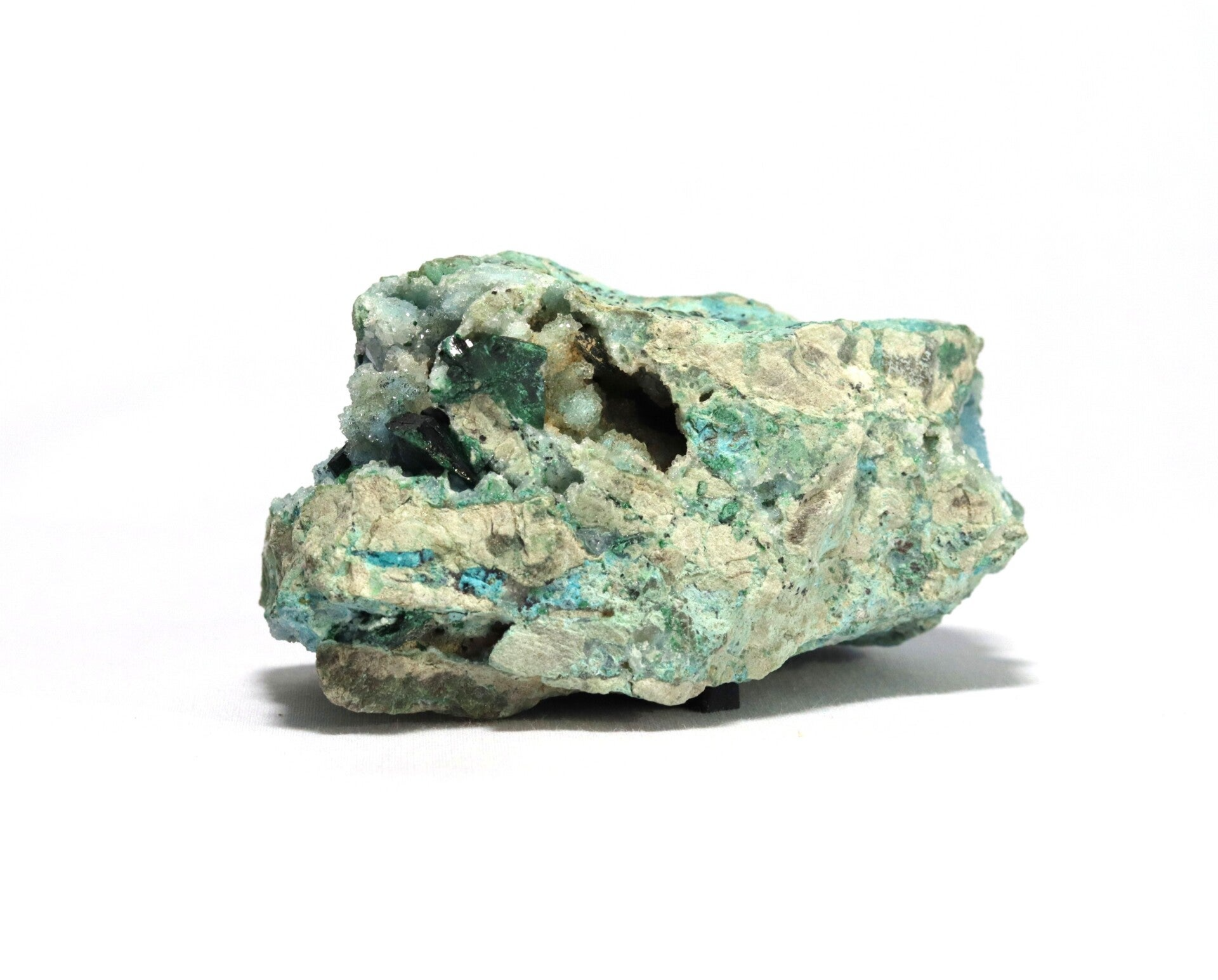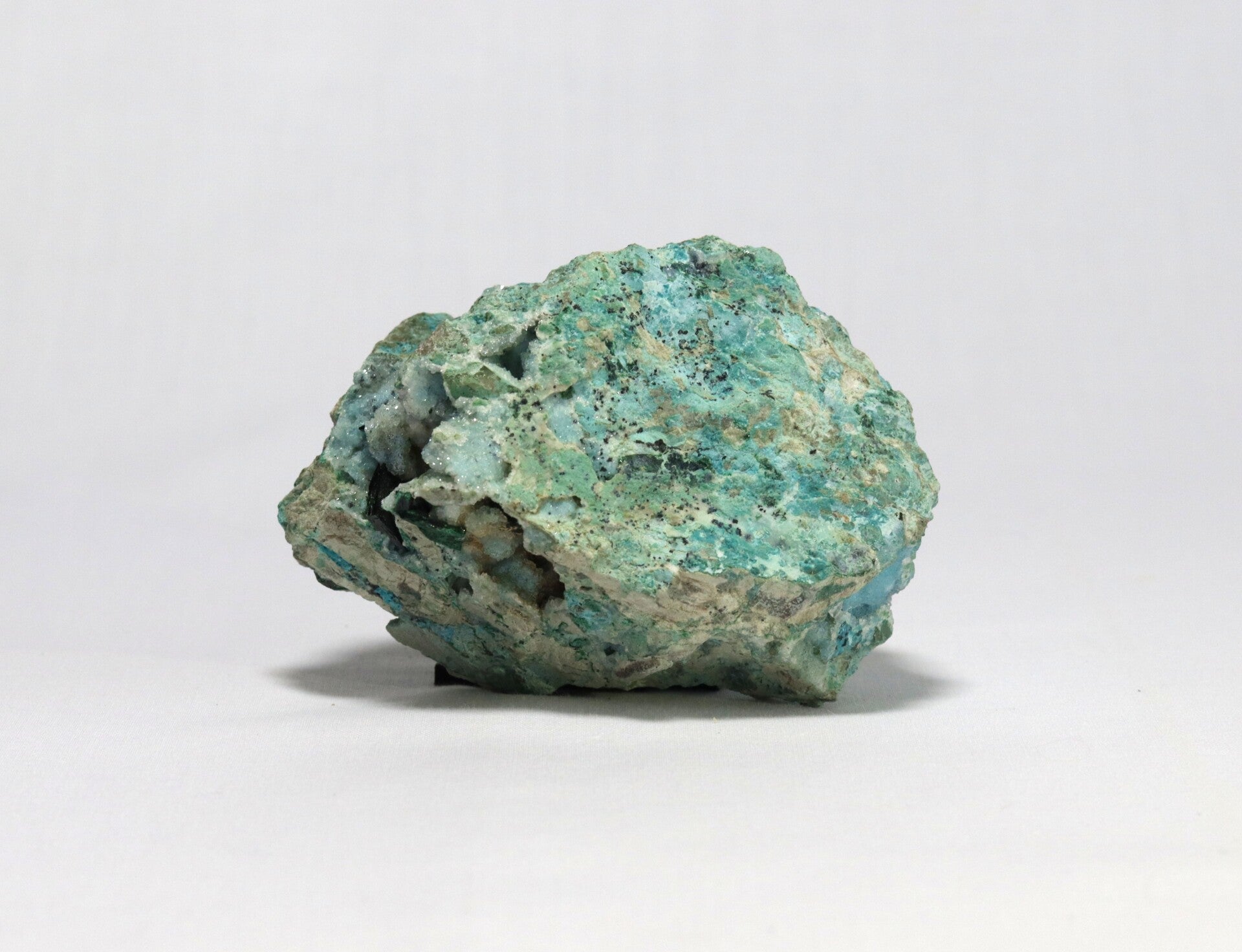 Temperatuur- en lichtgevoeligheid: Chrysocolla kan gevoelig zijn voor hoge temperaturen en plotselinge temperatuurwisselingen, wat tot barsten of kleurveranderingen kan leiden. Malachiet is gevoelig voor zuren en mechanische beschadiging, maar over het algemeen stabiel bij normaal licht en kamertemperatuur.
