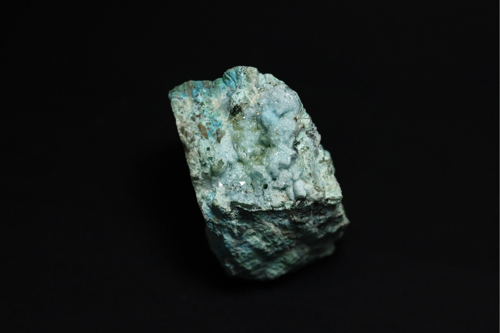 Vorming: Chrysocolla met malachiet ontstaat in de oxidatiezones van koperertsafzettingen, waar koperhoudende oplossingen reageren met silicaten en carbonaten. Malachiet vormt zich vaak eerst als primaire laag of knolvormige aggregaten, waarna chrysocolla zich afzet in scheuren, poriën of als een laag over de malachiet.