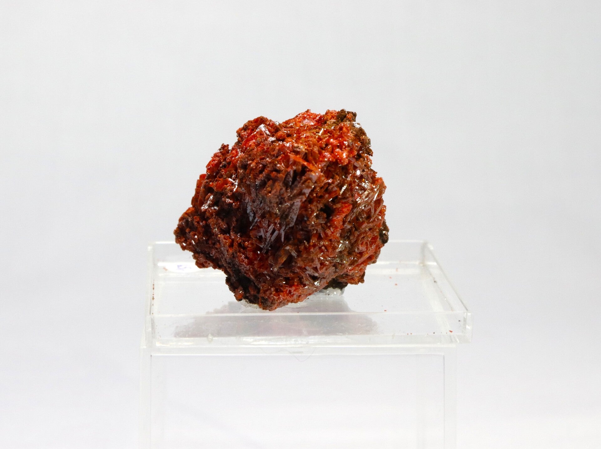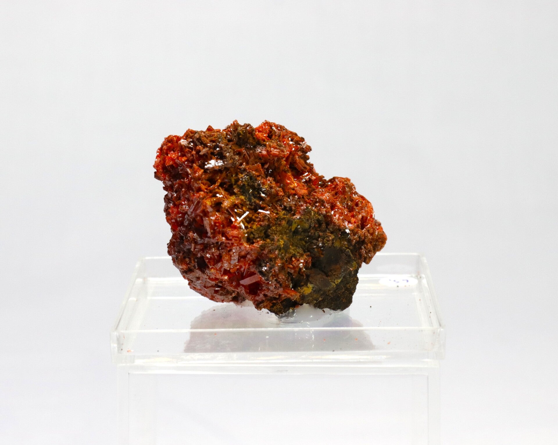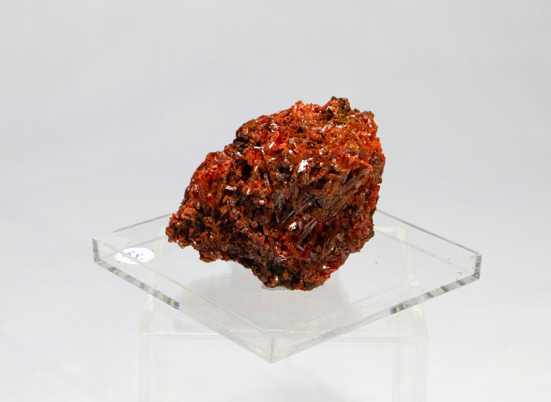 Crocoiet uit de Red Lead Mine is een opvallend mineraal dat bekendstaat om zijn intens oranje tot roodachtige kleur en slanke, prismatische kristalvormen.