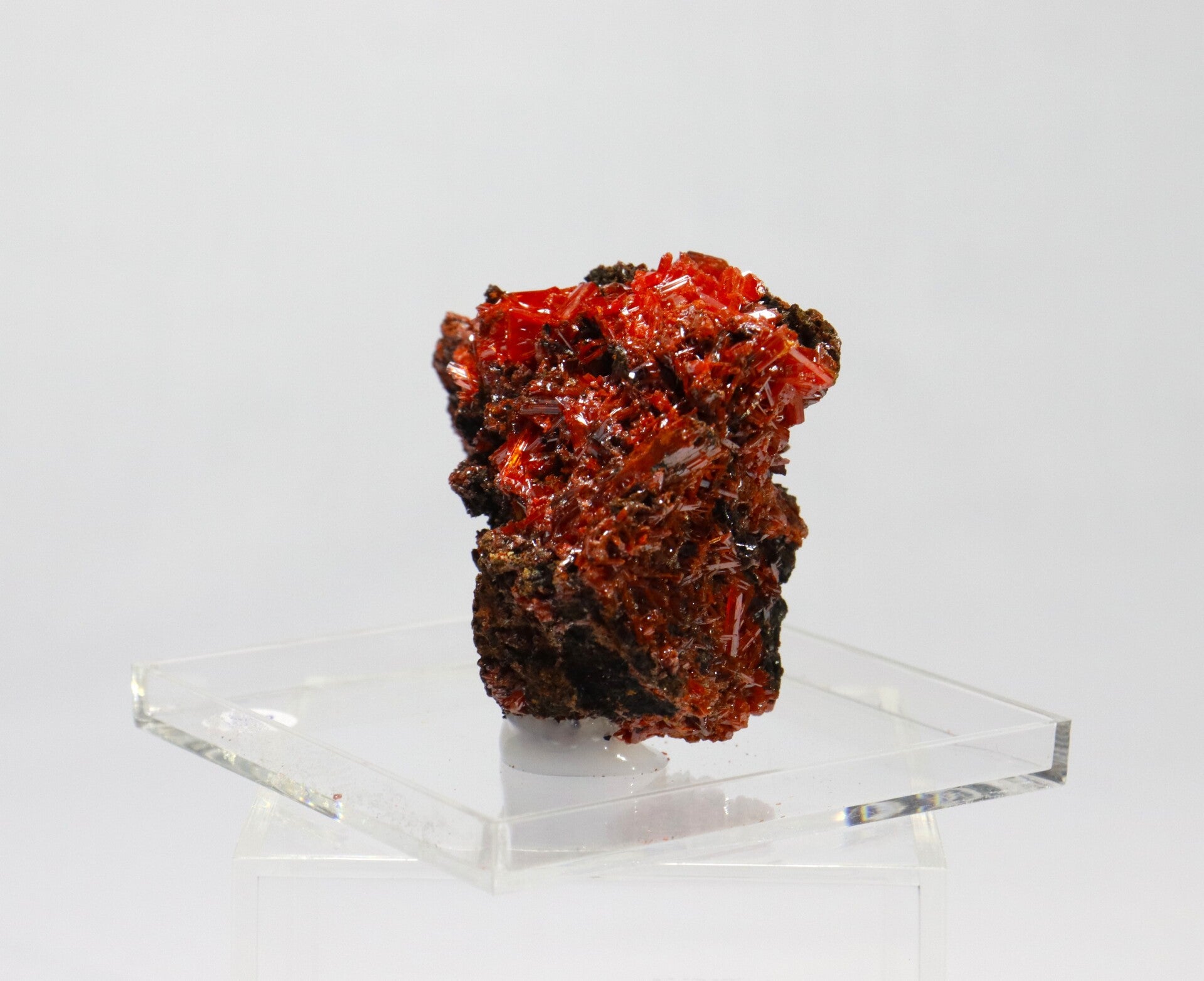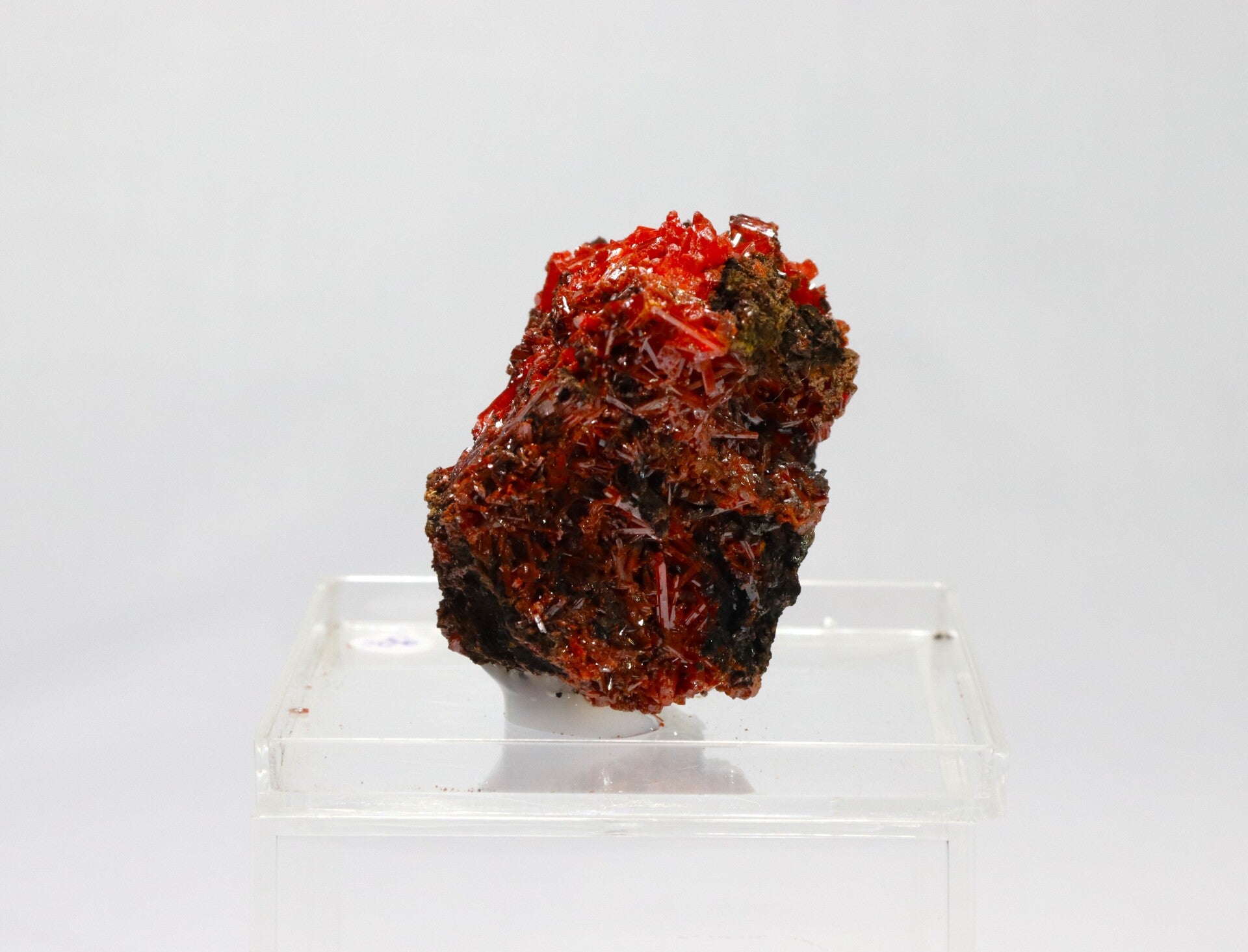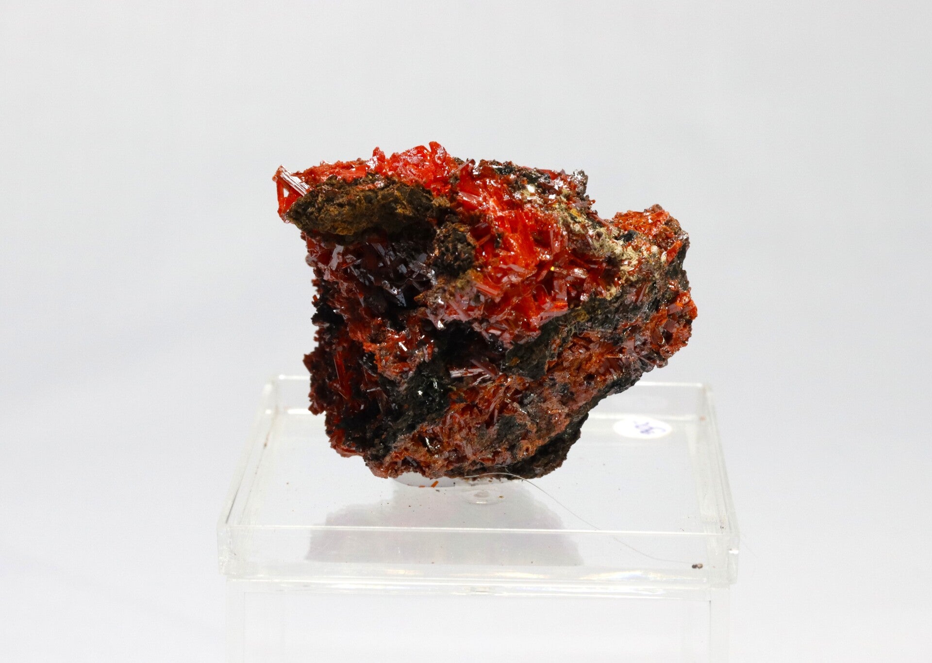 Crocoiet uit de Red Lead Mine is een opvallend mineraal dat bekendstaat om zijn intens oranje tot roodachtige kleur en slanke, prismatische kristalvormen.