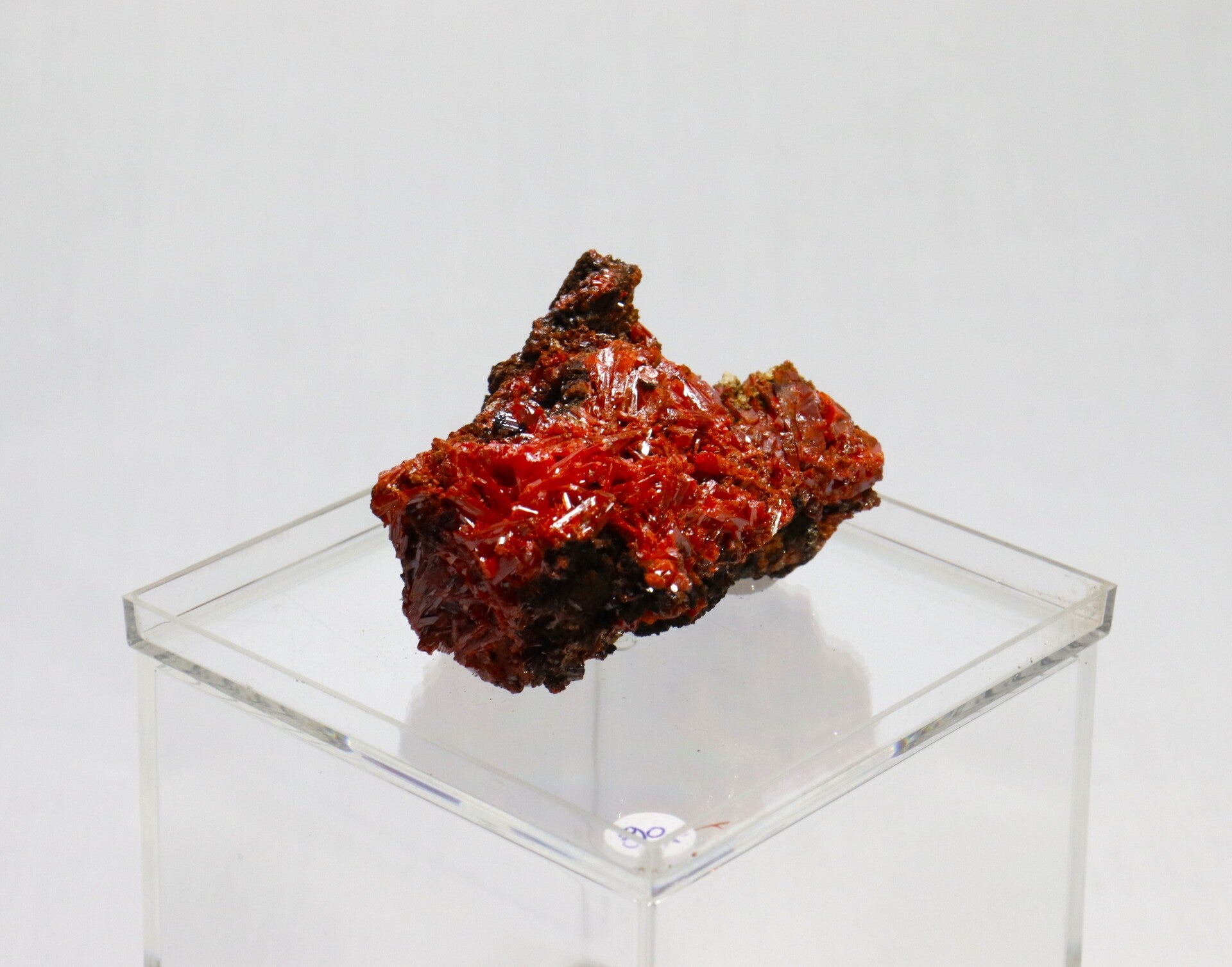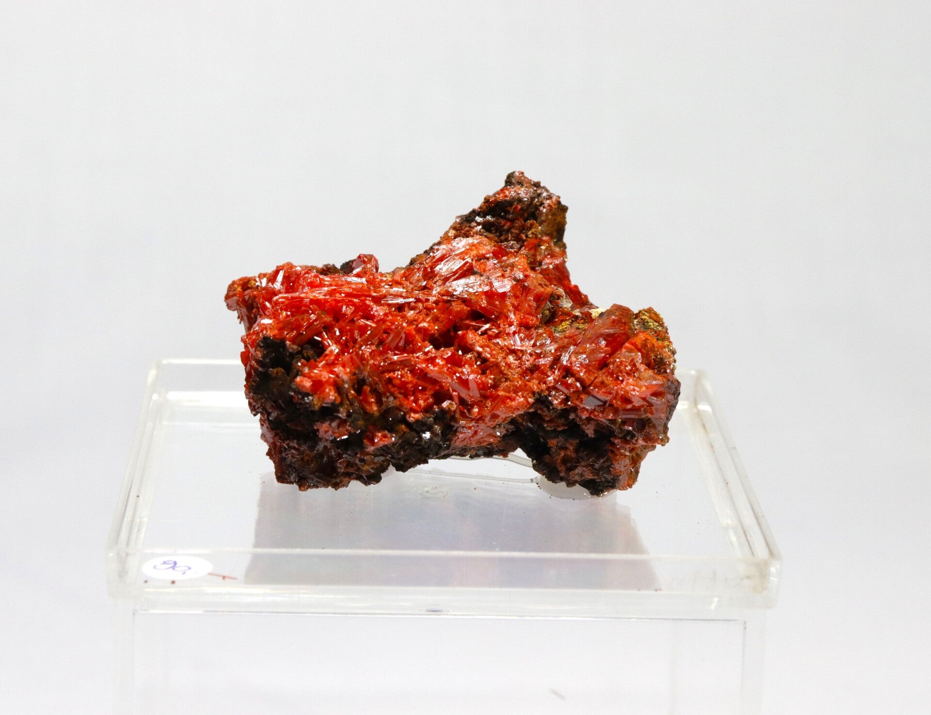 Crocoiet uit de Red Lead Mine is een opvallend mineraal dat bekendstaat om zijn intens oranje tot roodachtige kleur en slanke, prismatische kristalvormen.