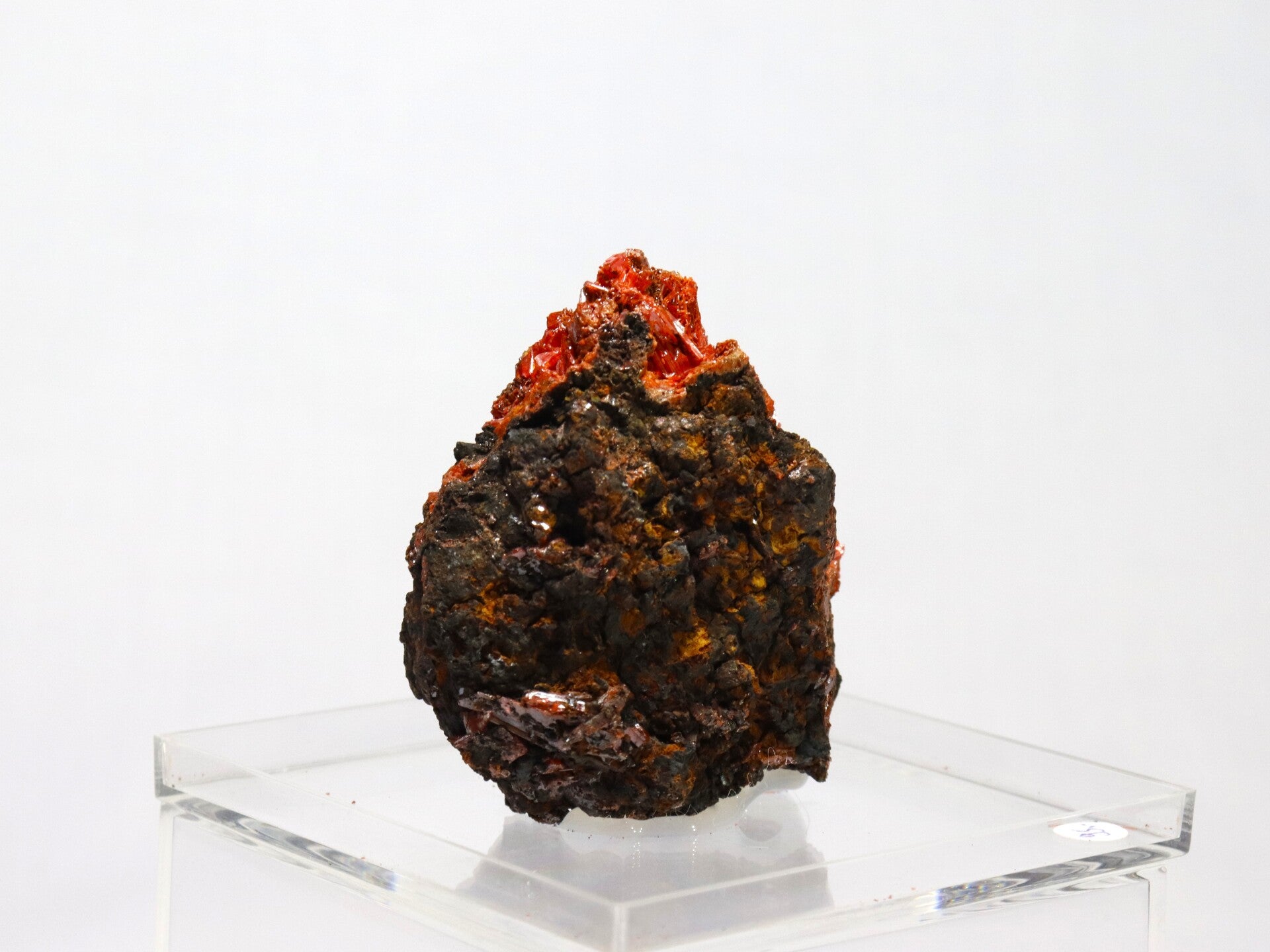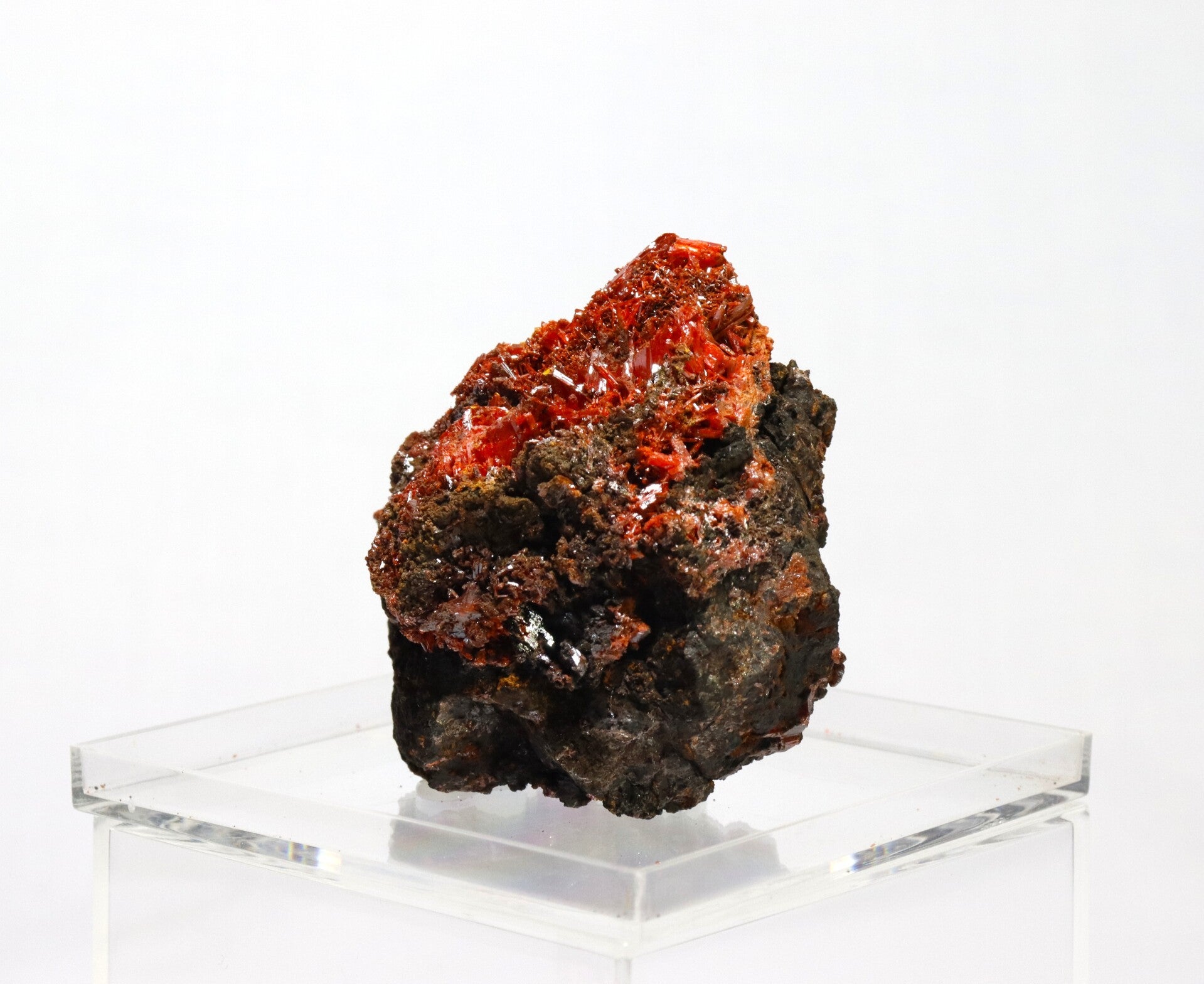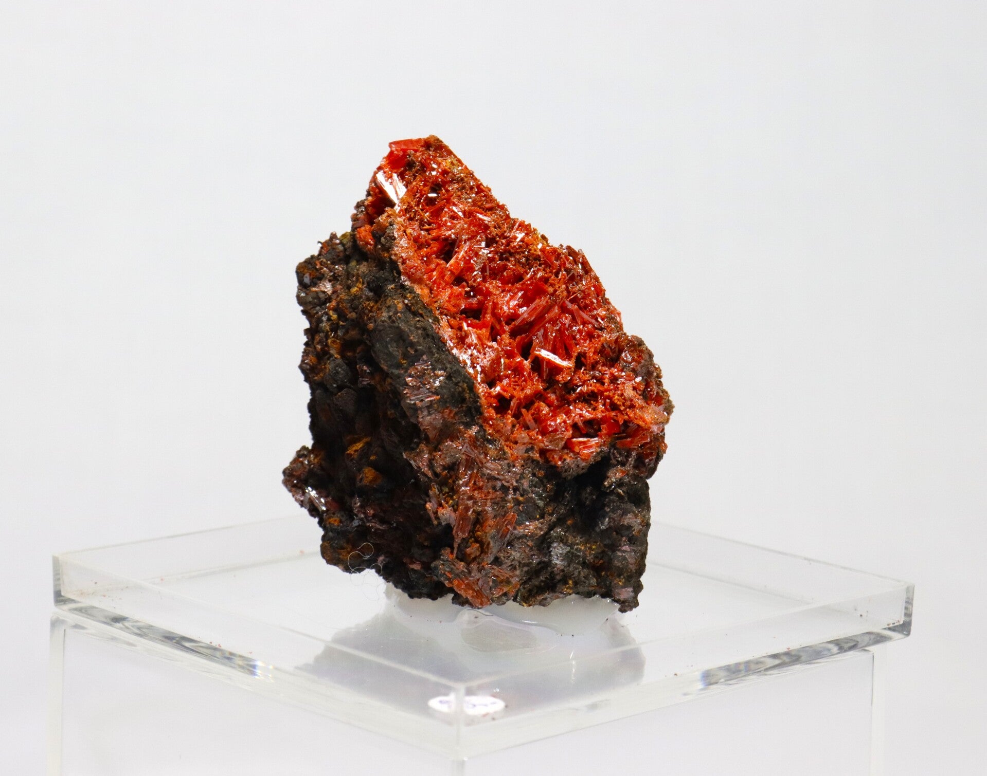 Crocoiet uit de Red Lead Mine is een opvallend mineraal dat bekendstaat om zijn intens oranje tot roodachtige kleur en slanke, prismatische kristalvormen.