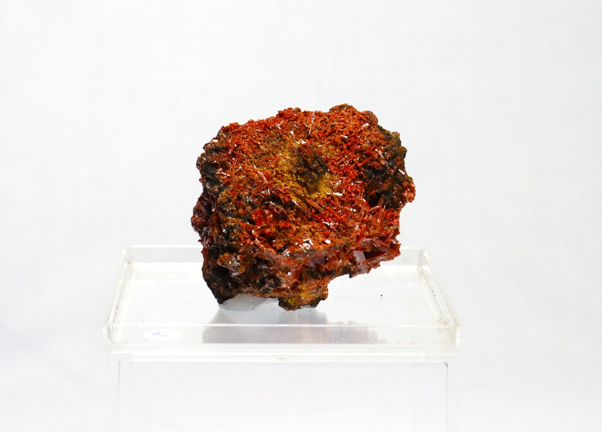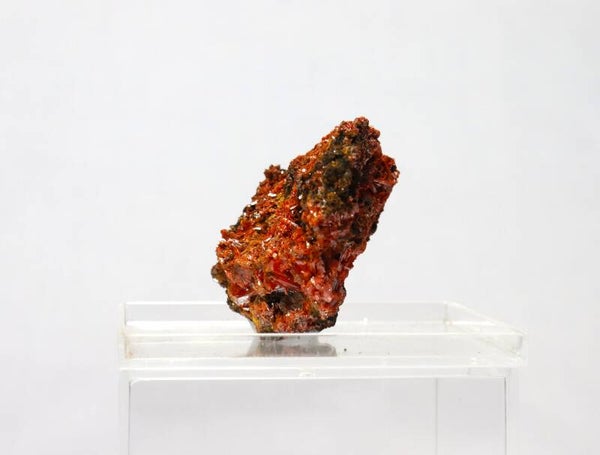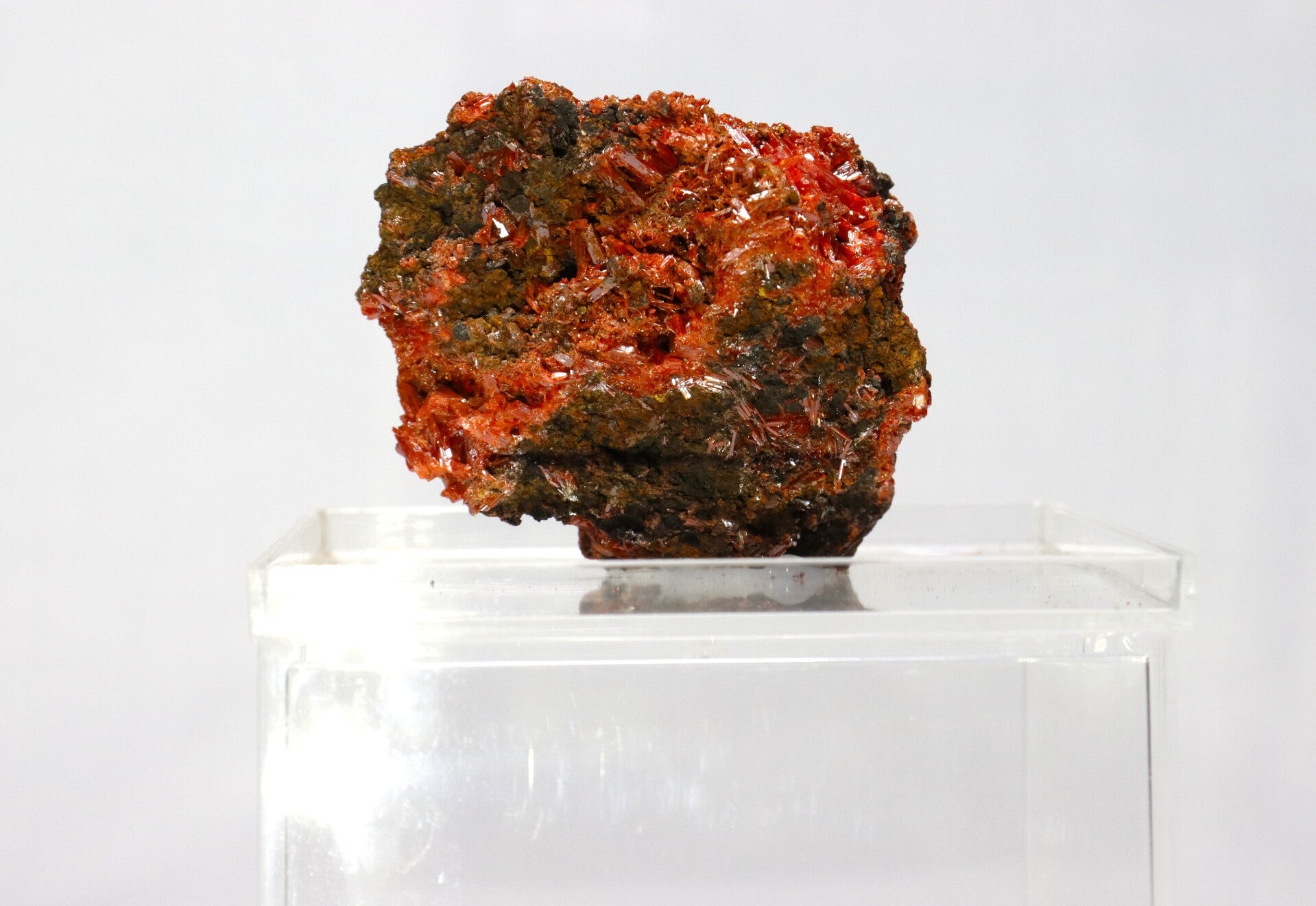 Crocoiet uit de Red Lead Mine is een opvallend mineraal dat bekendstaat om zijn intens oranje tot roodachtige kleur en slanke, prismatische kristalvormen.