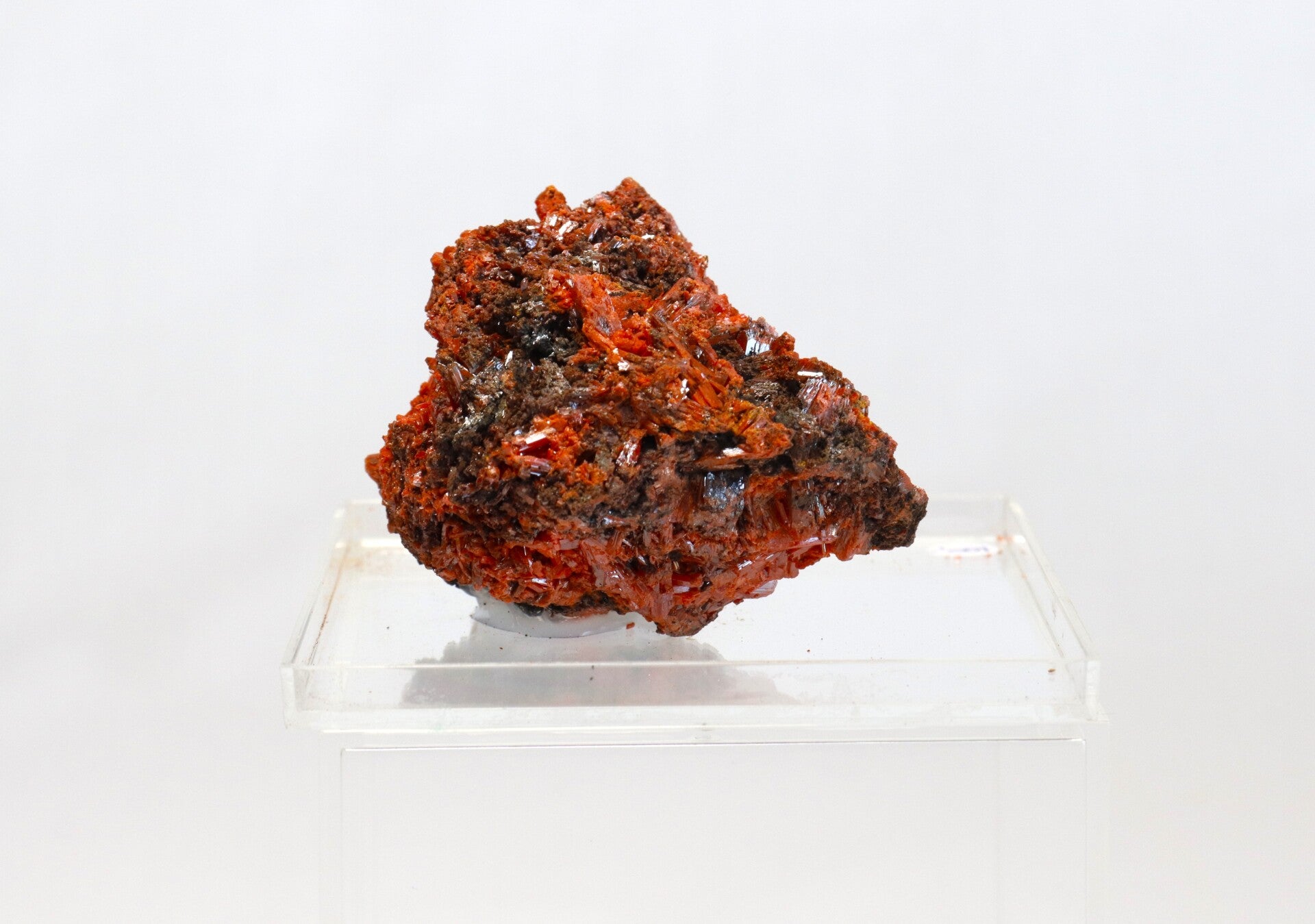 Crocoiet uit de Red Lead Mine is een opvallend mineraal dat bekendstaat om zijn intens oranje tot roodachtige kleur en slanke, prismatische kristalvormen.