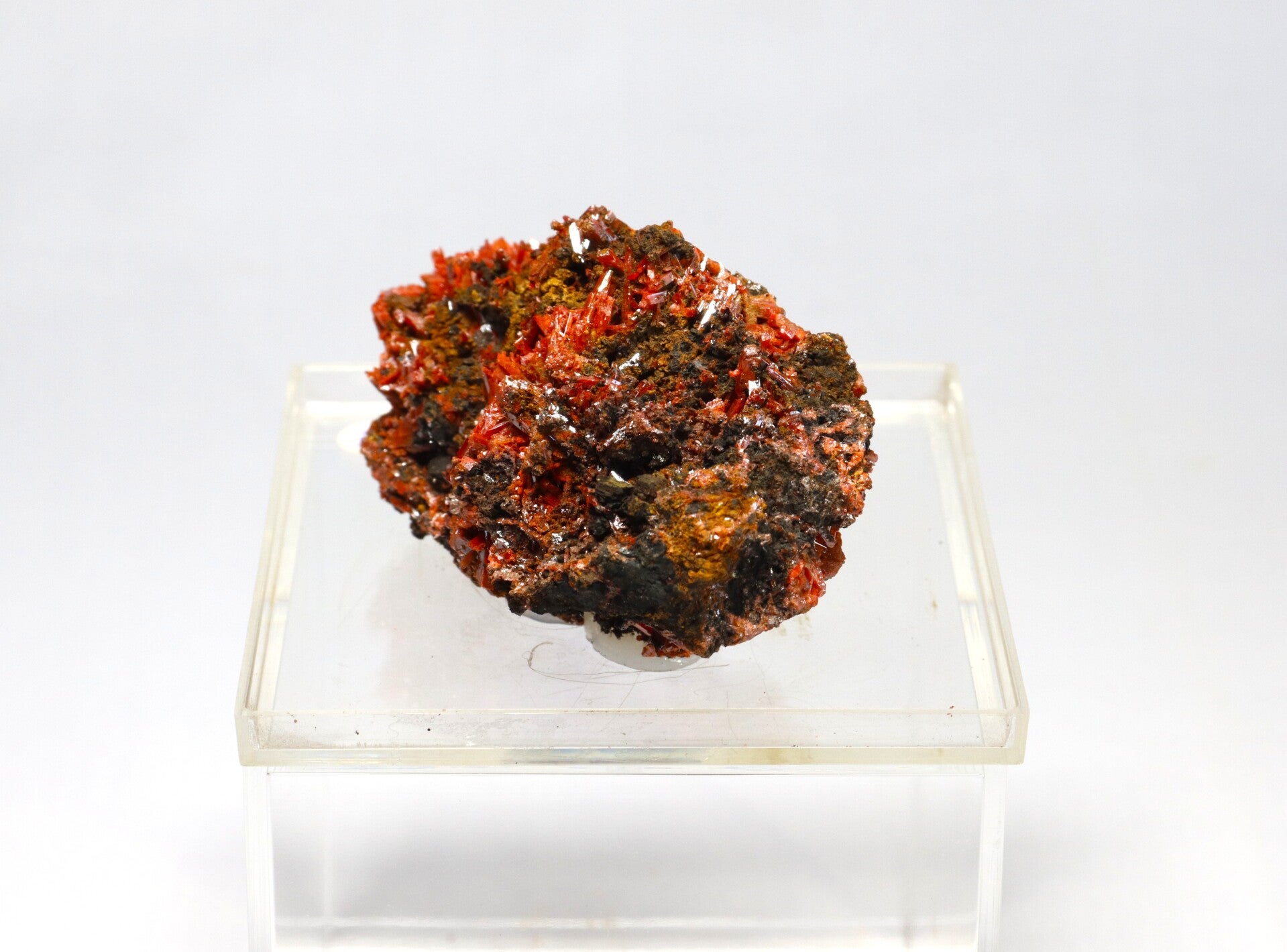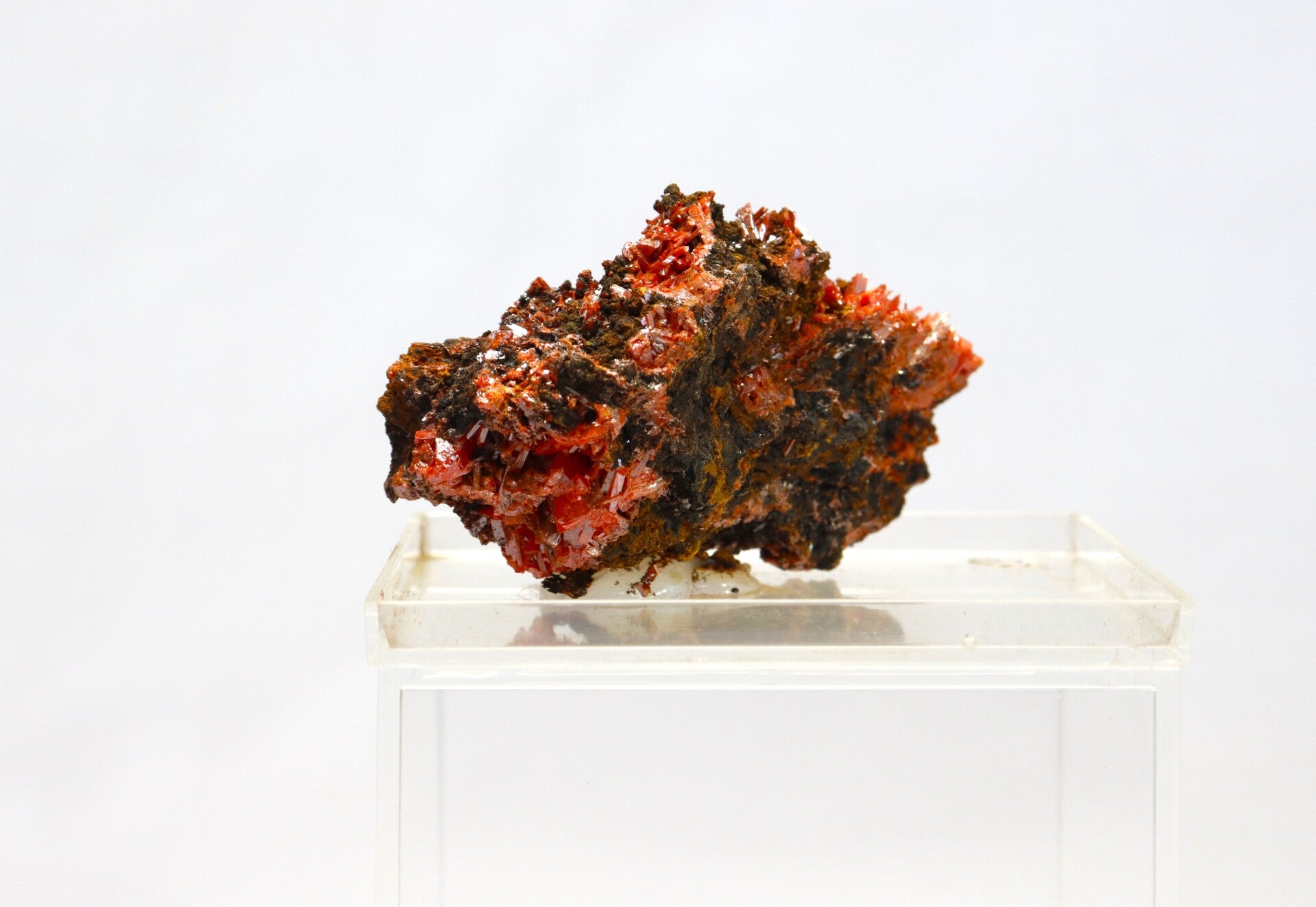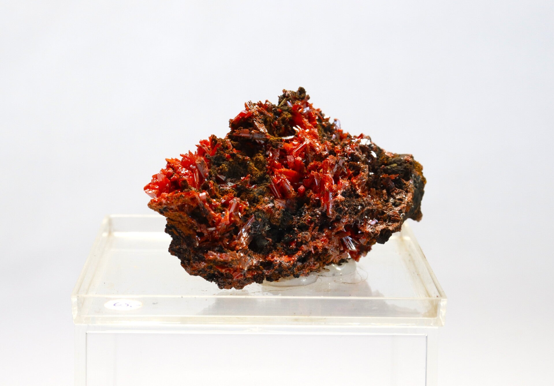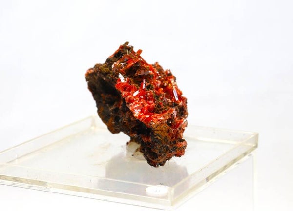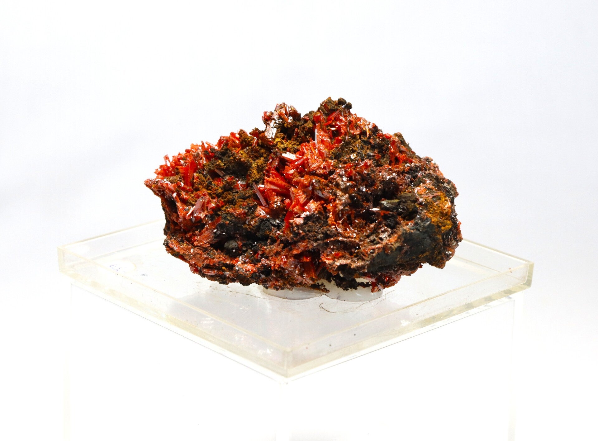 Crocoiet uit de Red Lead Mine is een opvallend mineraal dat bekendstaat om zijn intens oranje tot roodachtige kleur en slanke, prismatische kristalvormen.