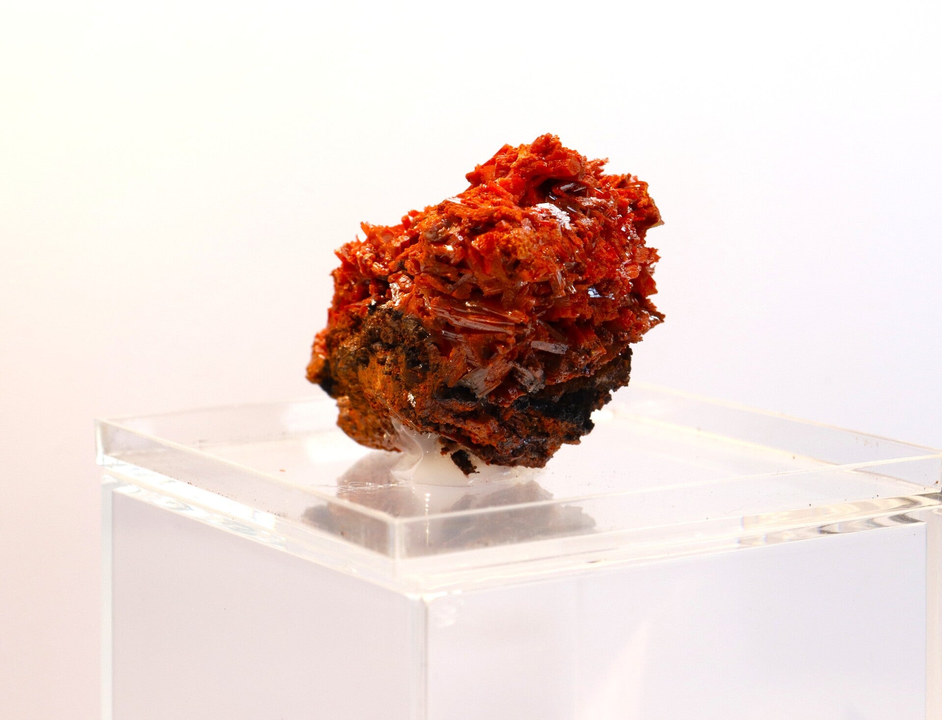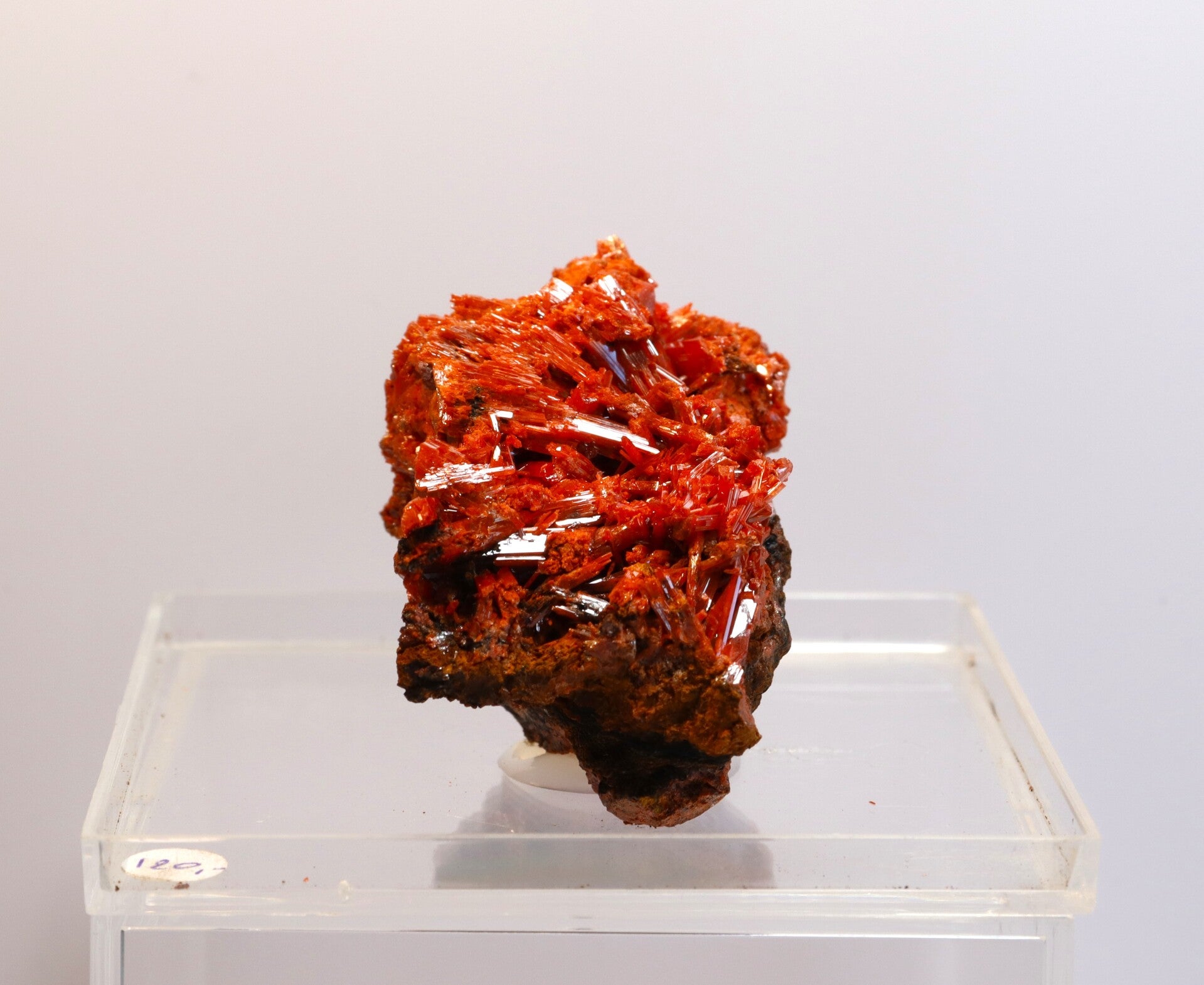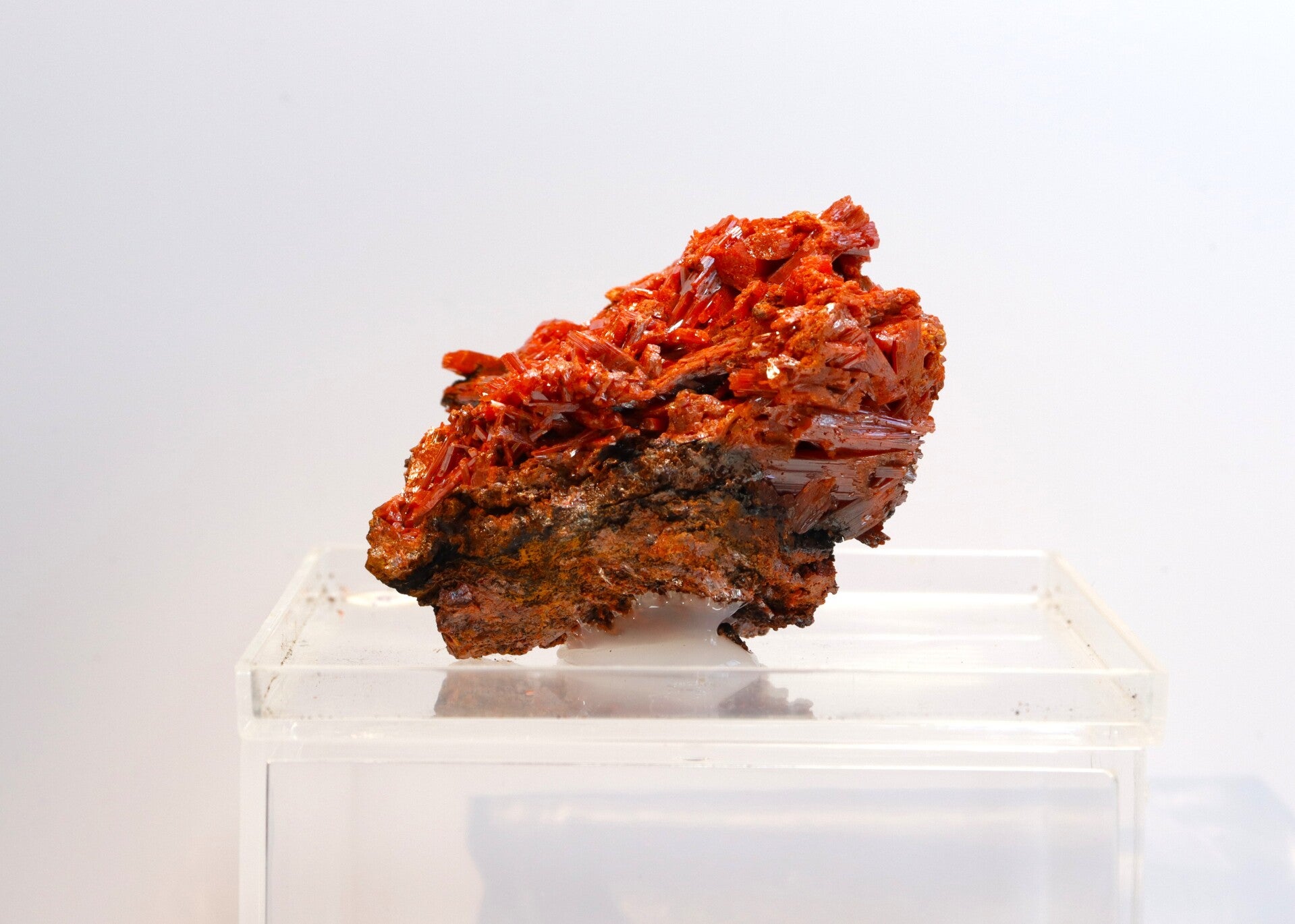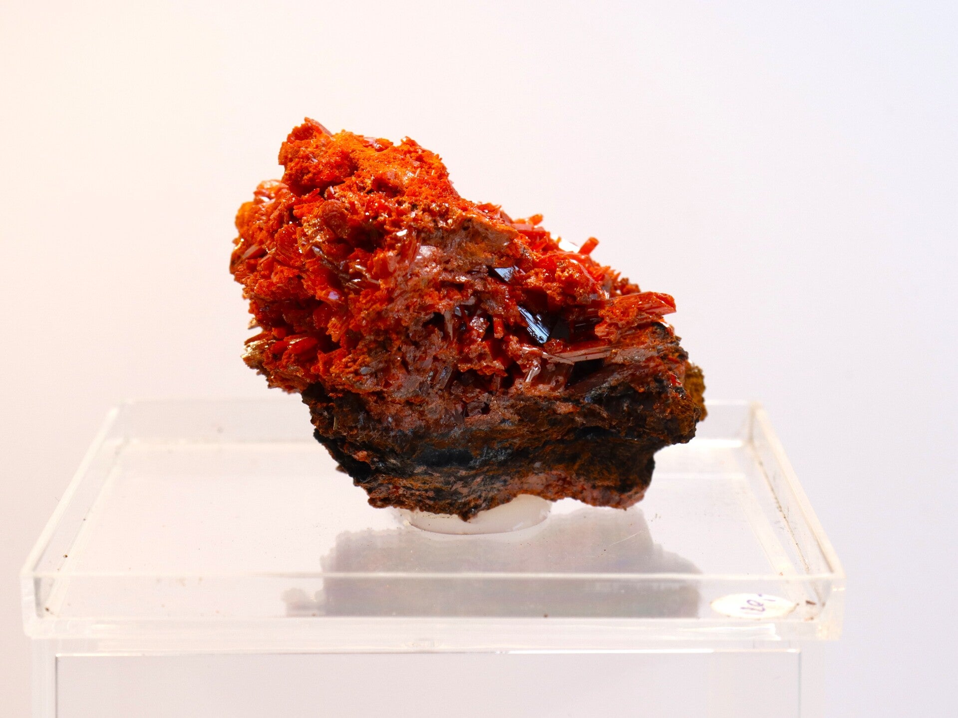 Crocoiet uit de Red Lead Mine is een opvallend mineraal dat bekendstaat om zijn intens oranje tot roodachtige kleur en slanke, prismatische kristalvormen.