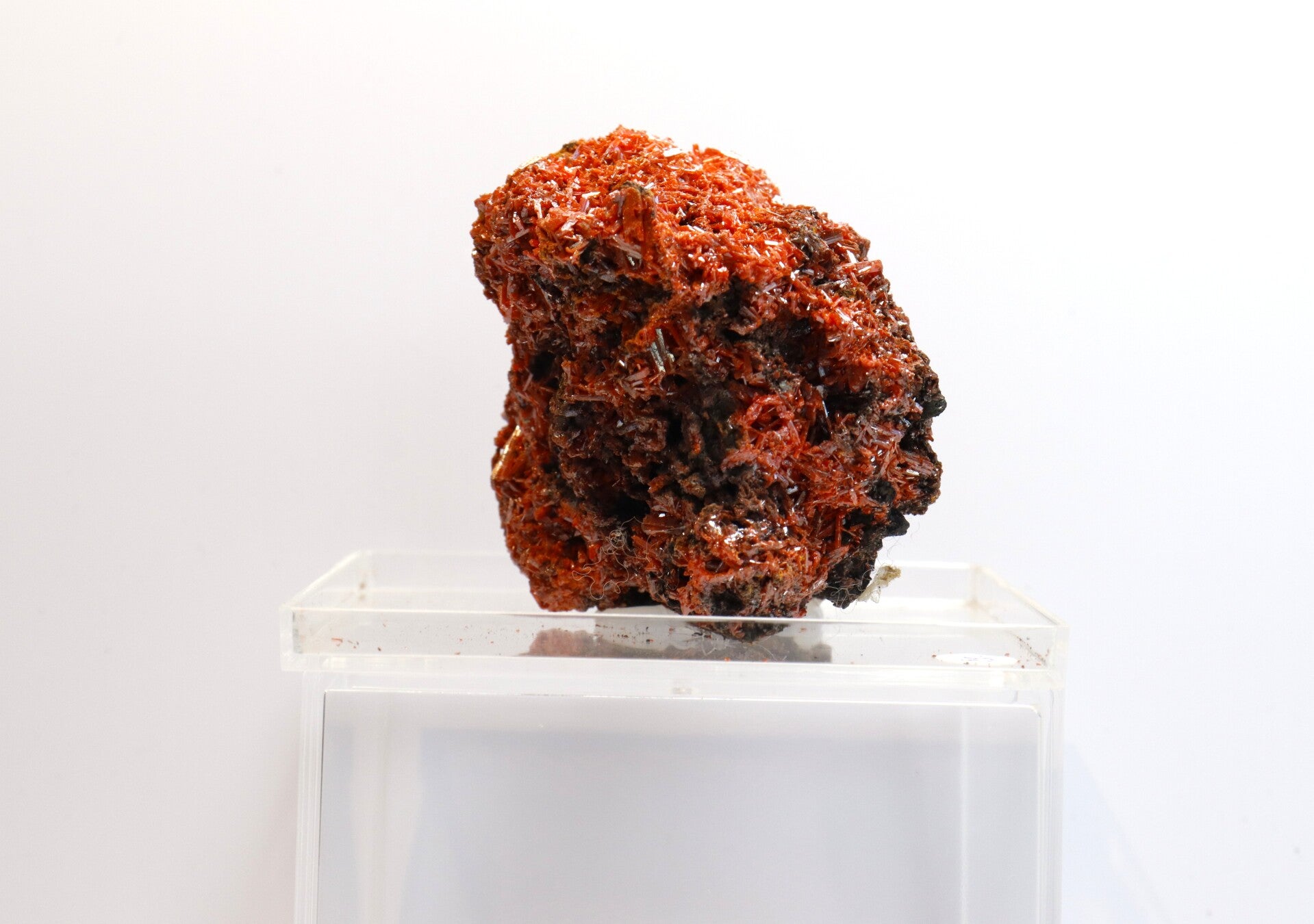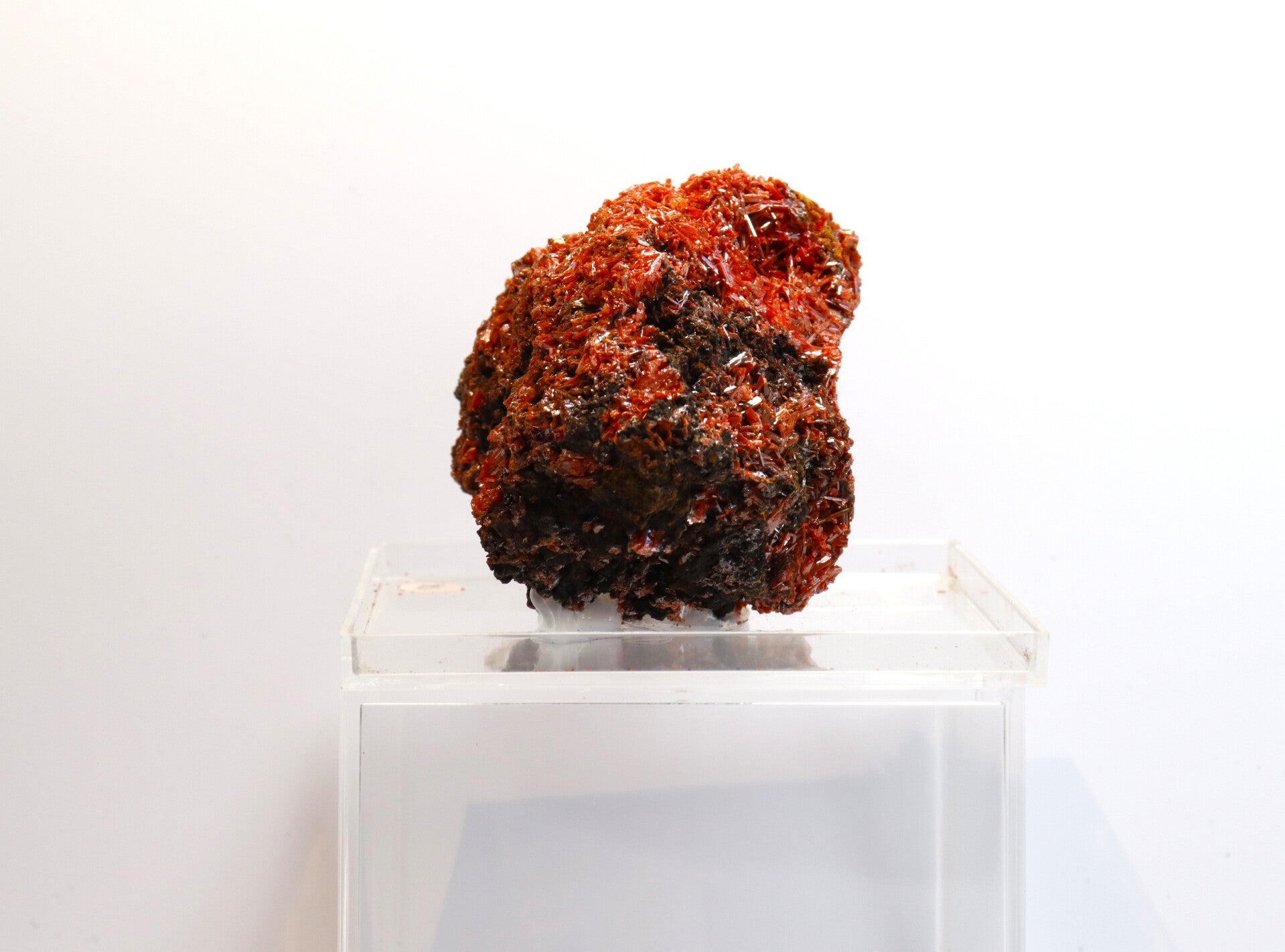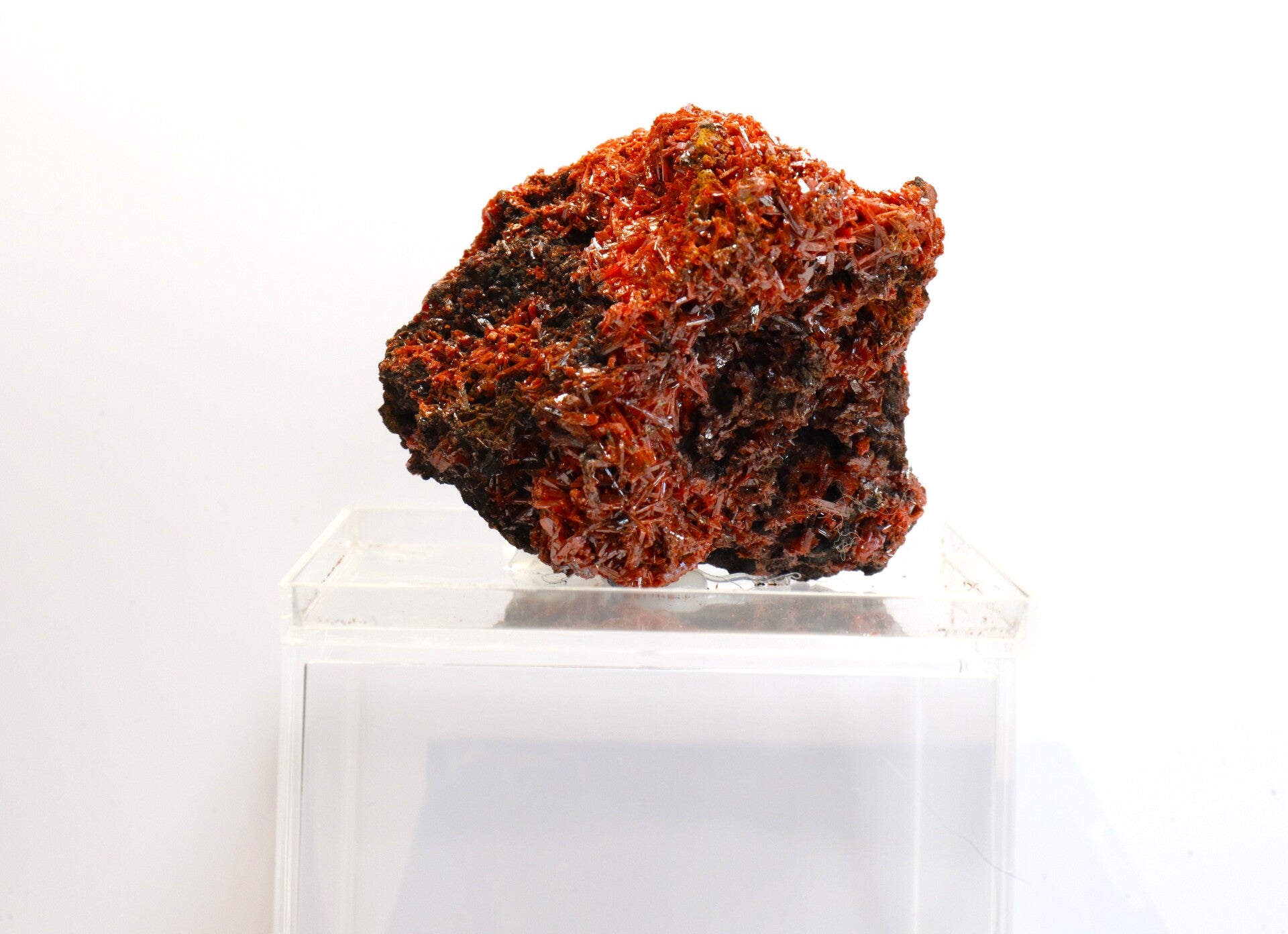 Crocoiet uit de Red Lead Mine is een opvallend mineraal dat bekendstaat om zijn intens oranje tot roodachtige kleur en slanke, prismatische kristalvormen.
