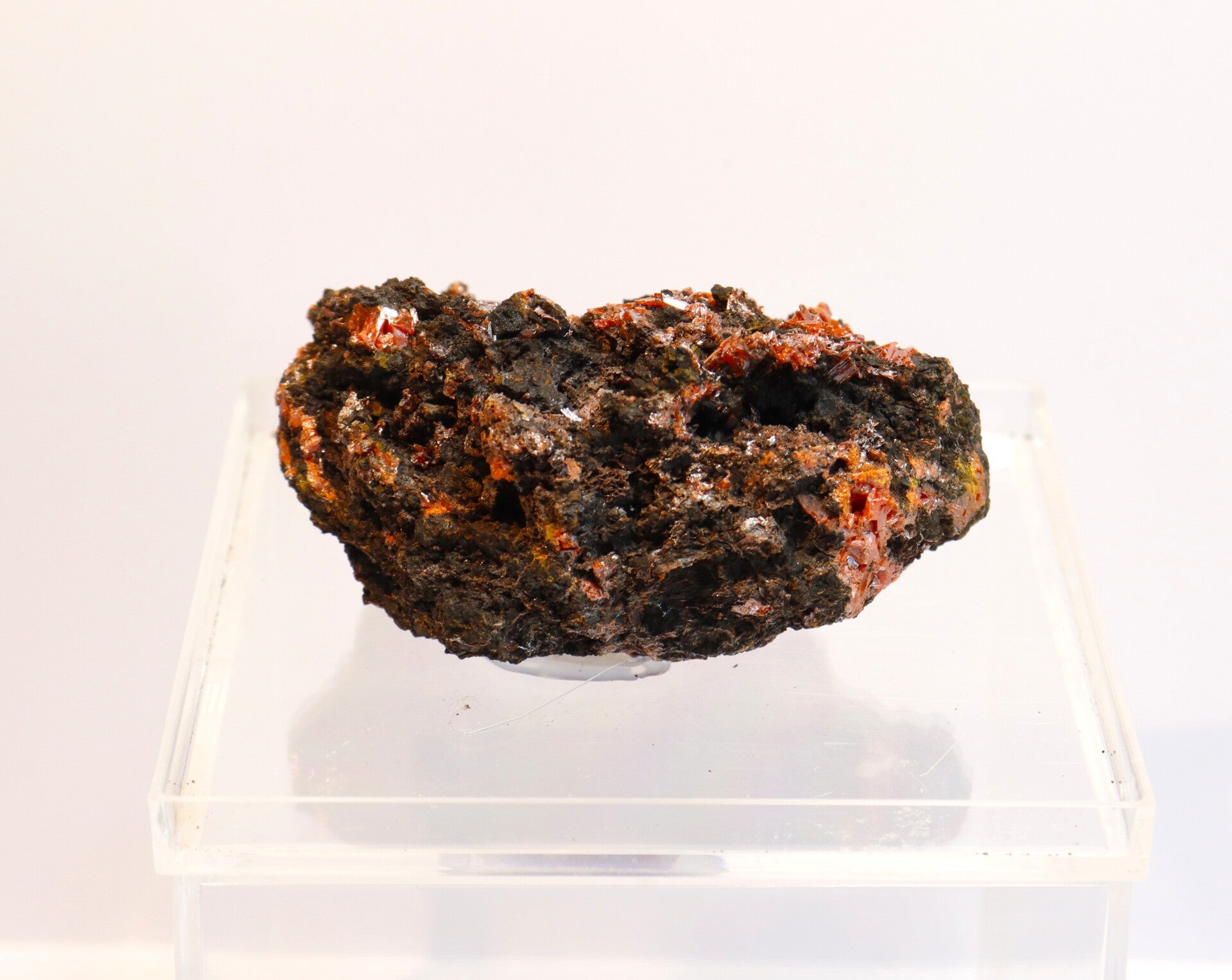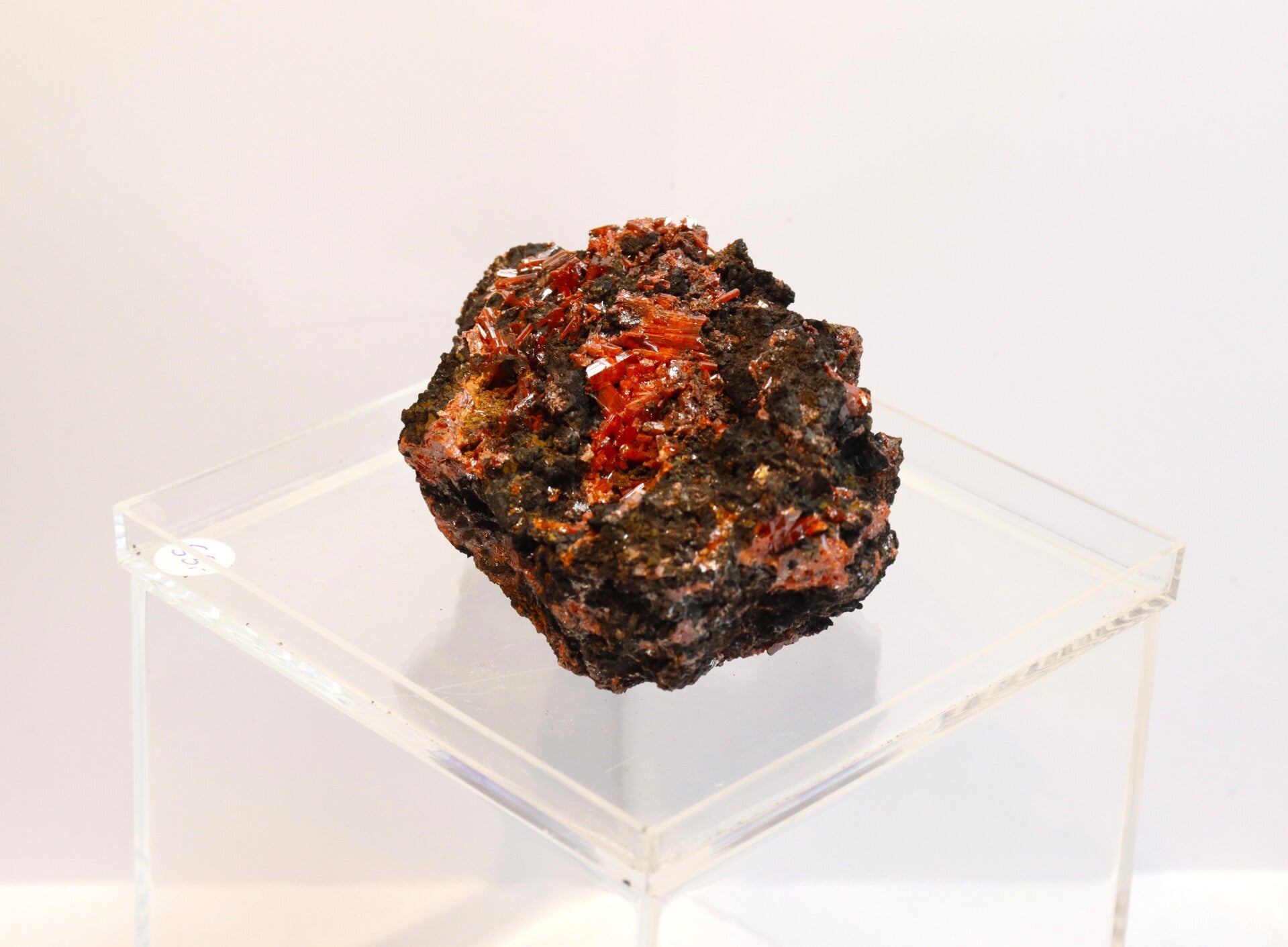 Crocoiet uit de Red Lead Mine is een opvallend mineraal dat bekendstaat om zijn intens oranje tot roodachtige kleur en slanke, prismatische kristalvormen.