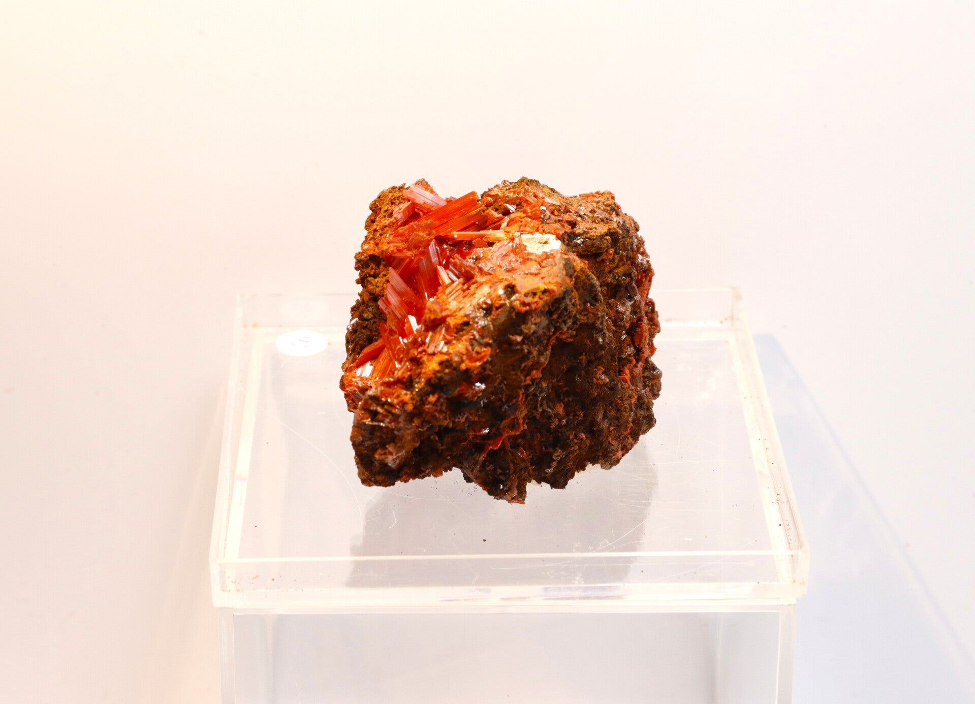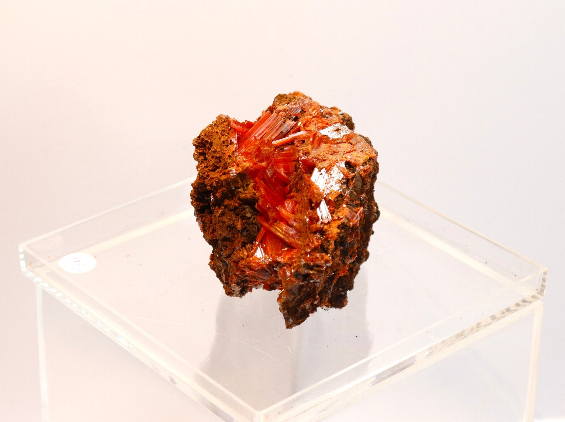 Crocoiet uit de Red Lead Mine is een opvallend mineraal dat bekendstaat om zijn intens oranje tot roodachtige kleur en slanke, prismatische kristalvormen.