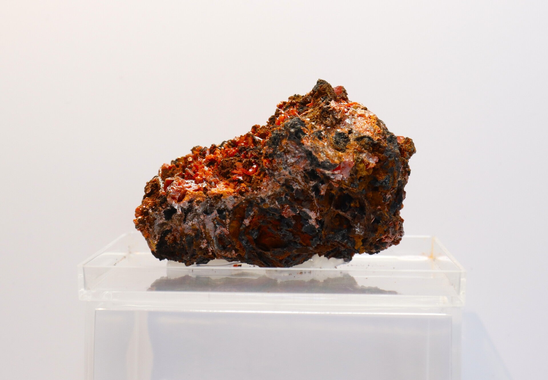 Temperatuur- en lichtgevoeligheid: Crocoiet is gevoelig voor mechanische belasting en plotselinge temperatuurwisselingen, en langdurige blootstelling aan fel licht kan de kleur op oppervlakken licht doen vervagen. Het mineraal is bovendien chemisch gevoelig voor zuren.