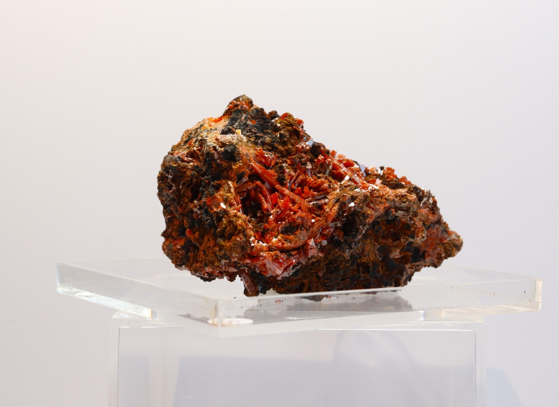Crocoiet uit de Red Lead Mine is een opvallend mineraal dat bekendstaat om zijn intens oranje tot roodachtige kleur en slanke, prismatische kristalvormen.