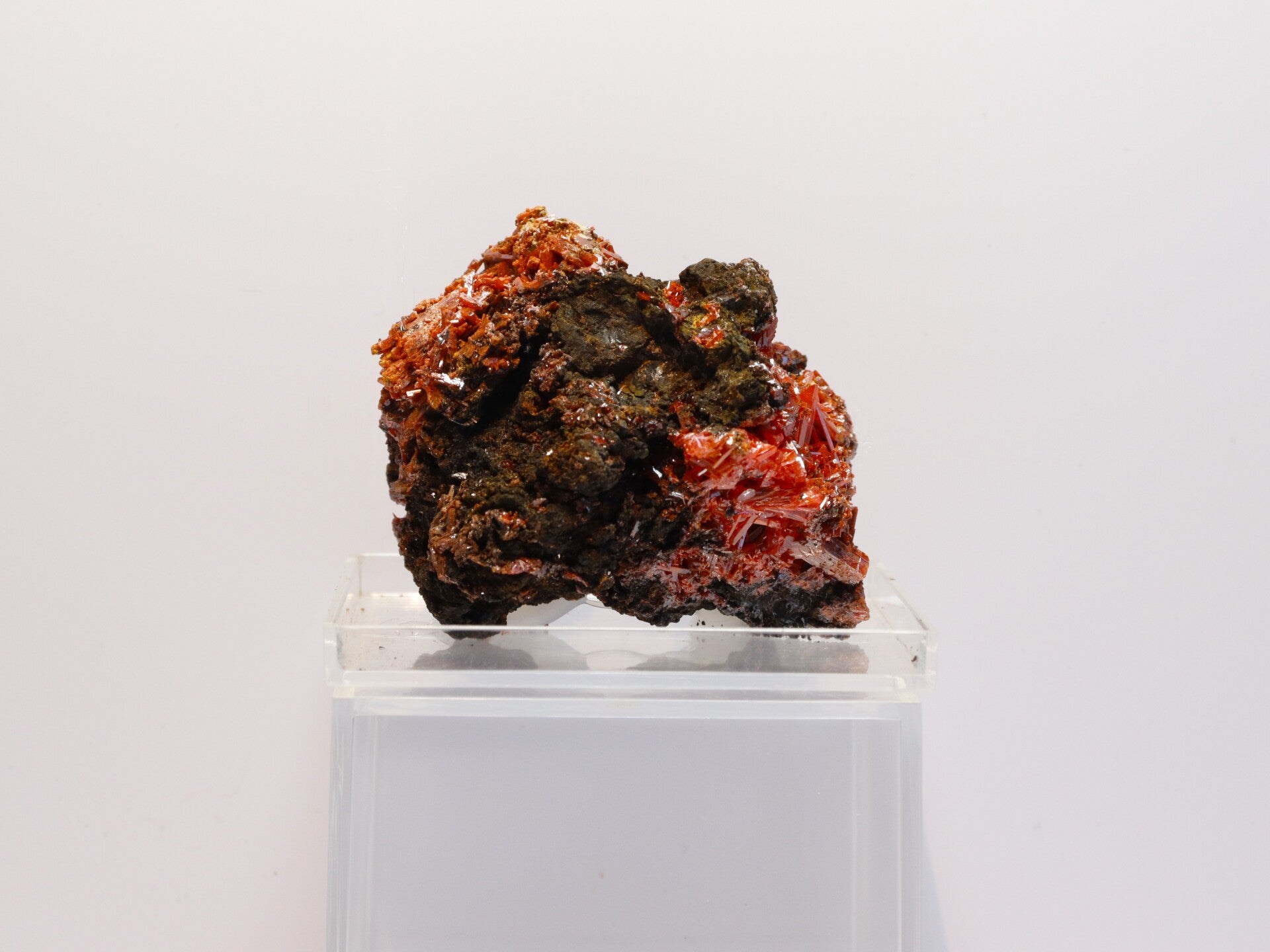 Crocoiet uit de Red Lead Mine is een opvallend mineraal dat bekendstaat om zijn intens oranje tot roodachtige kleur en slanke, prismatische kristalvormen.