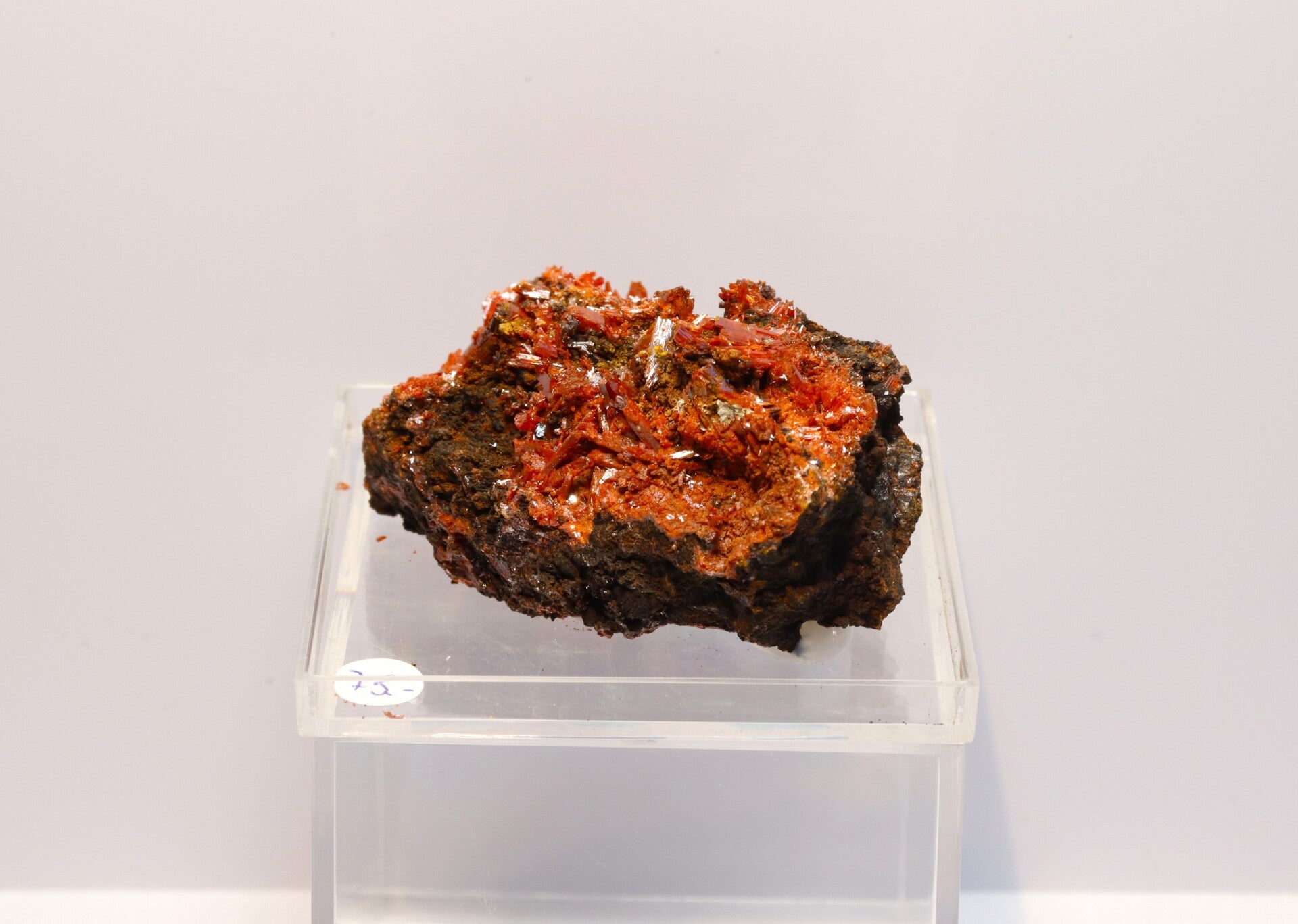 Crocoiet uit de Red Lead Mine is een opvallend mineraal dat bekendstaat om zijn intens oranje tot roodachtige kleur en slanke, prismatische kristalvormen.