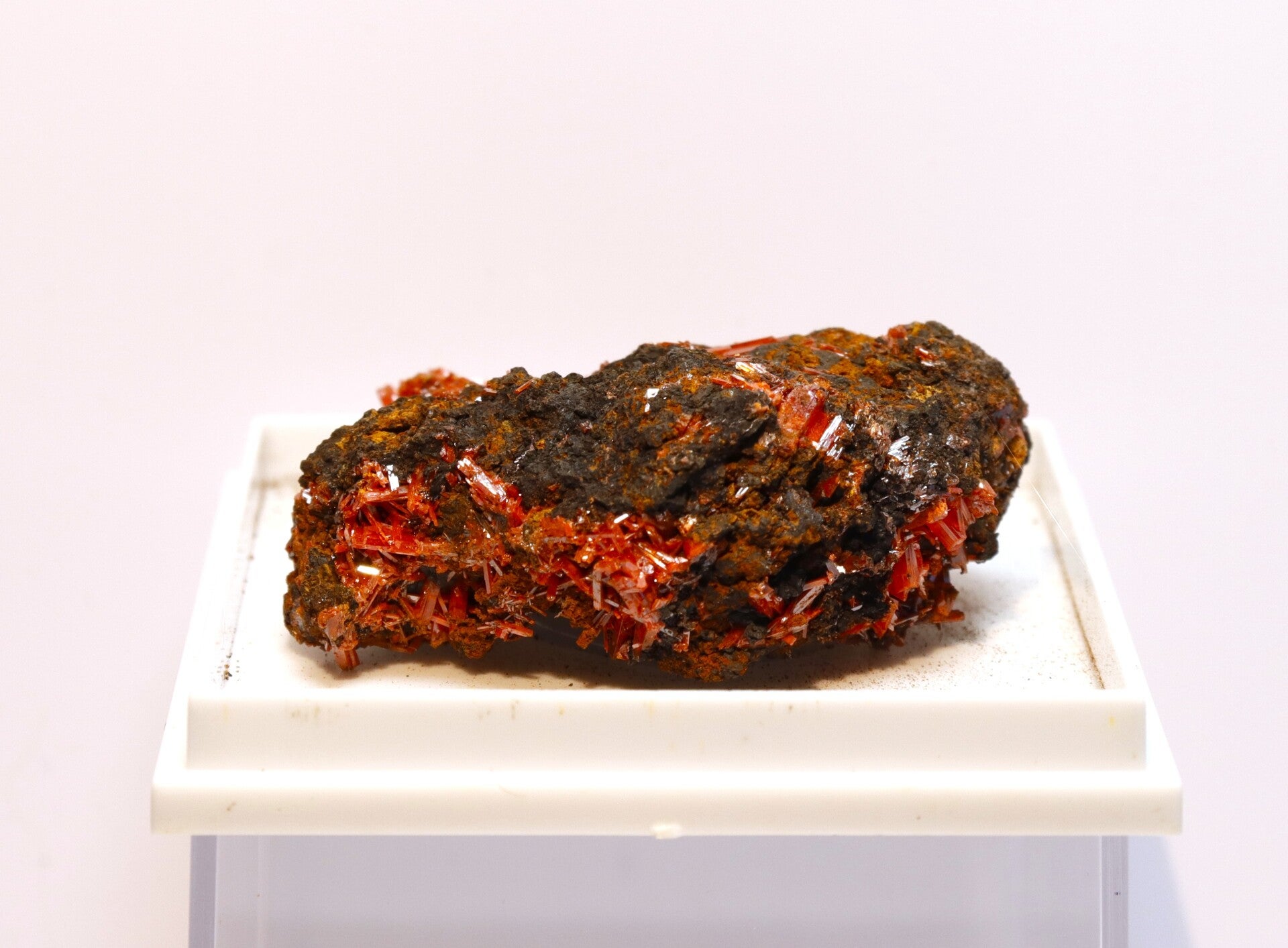 Crocoiet uit de Red Lead Mine is een opvallend mineraal dat bekendstaat om zijn intens oranje tot roodachtige kleur en slanke, prismatische kristalvormen.