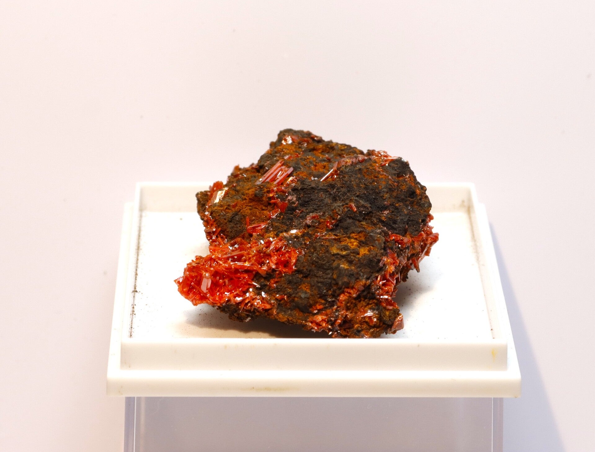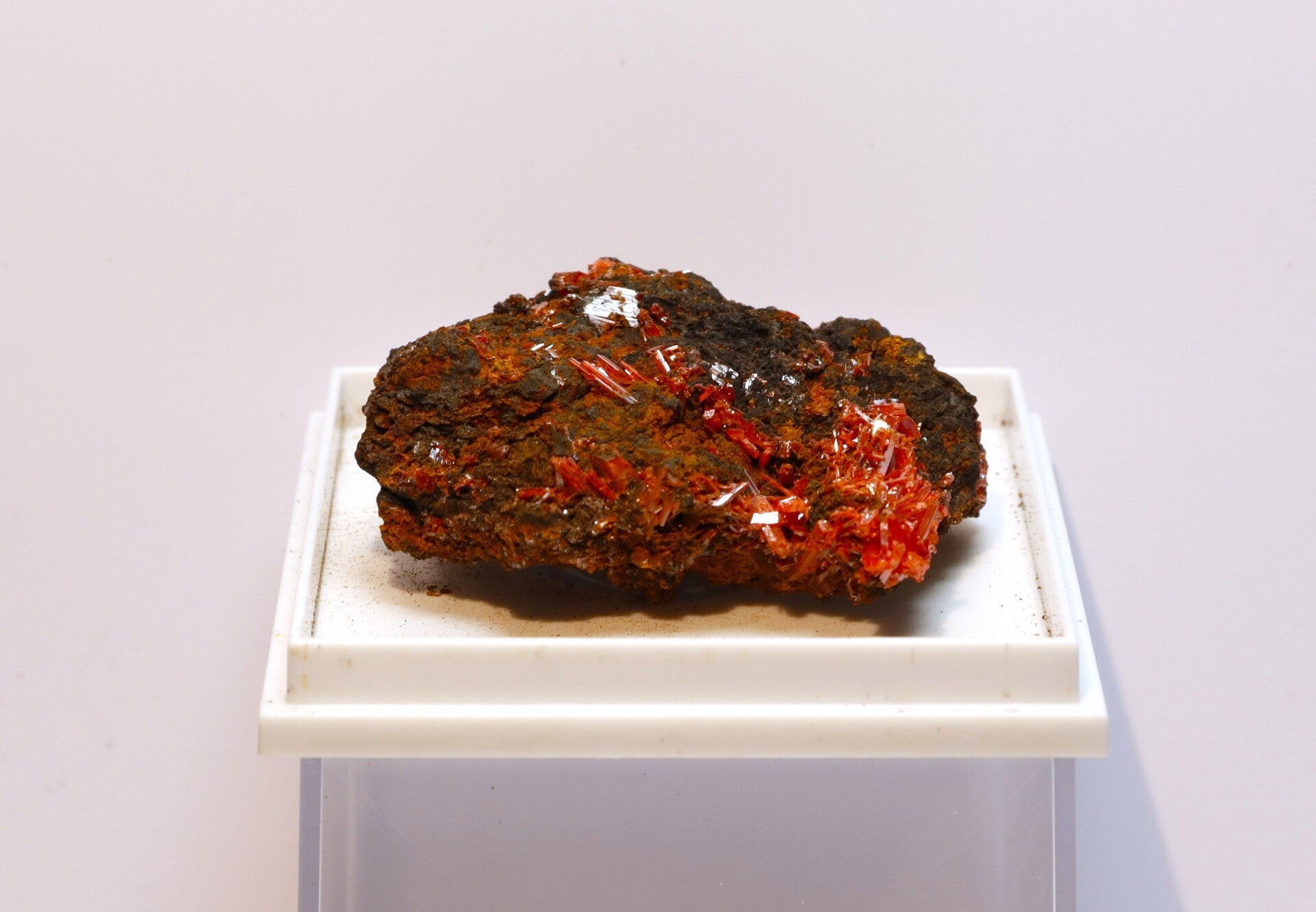 Temperatuur- en lichtgevoeligheid: Crocoiet is gevoelig voor mechanische belasting en plotselinge temperatuurwisselingen, en langdurige blootstelling aan fel licht kan de kleur op oppervlakken licht doen vervagen. Het mineraal is bovendien chemisch gevoelig voor zuren.