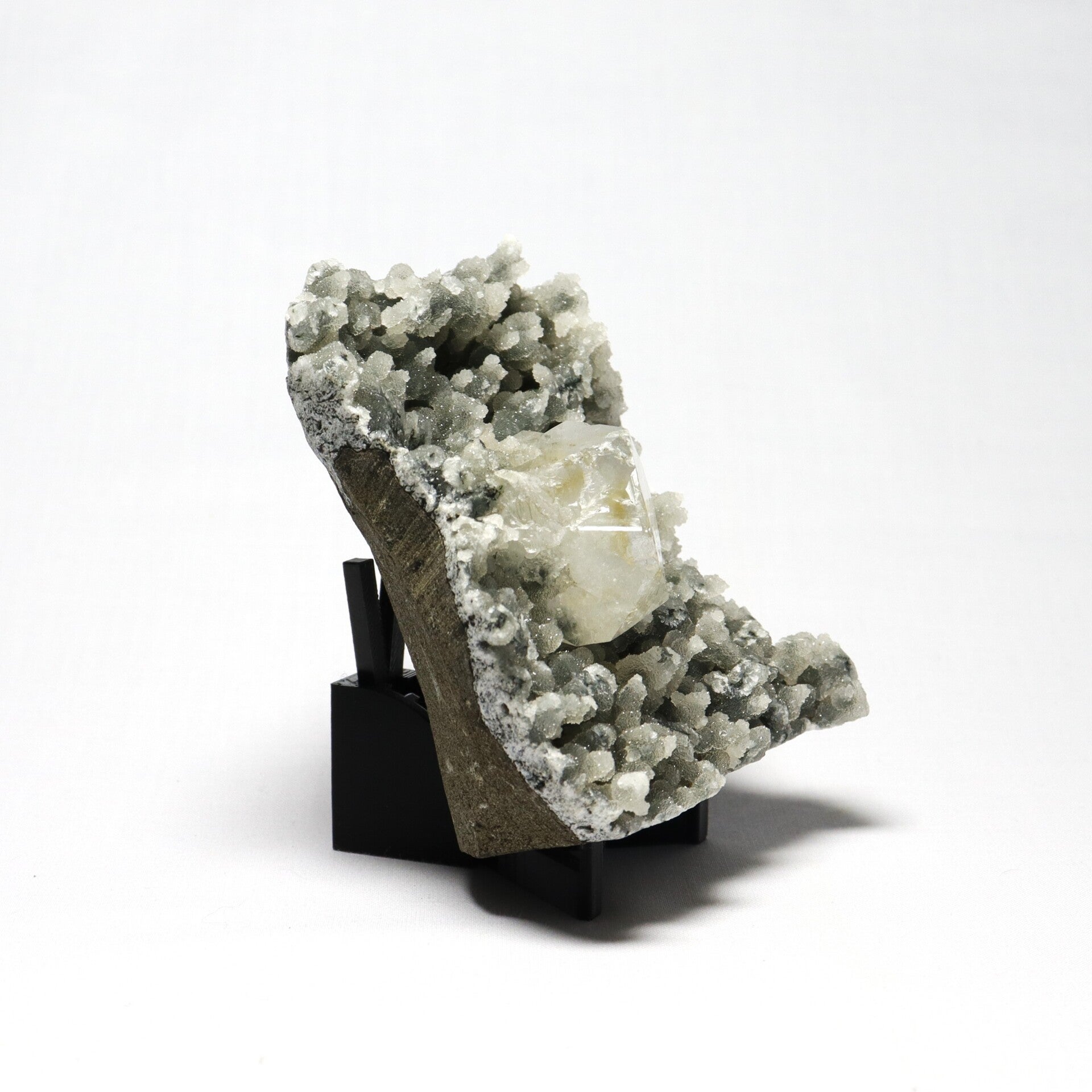 Zwarte chalcedoon met apofylliet is een mooie contrasterende mineraalcombinatie met donkere chalcedoon als basis en daarop heldere apofyllietkristallen, soms ook gepaard met oranje/roze stilbiet (zie onze andere producten).