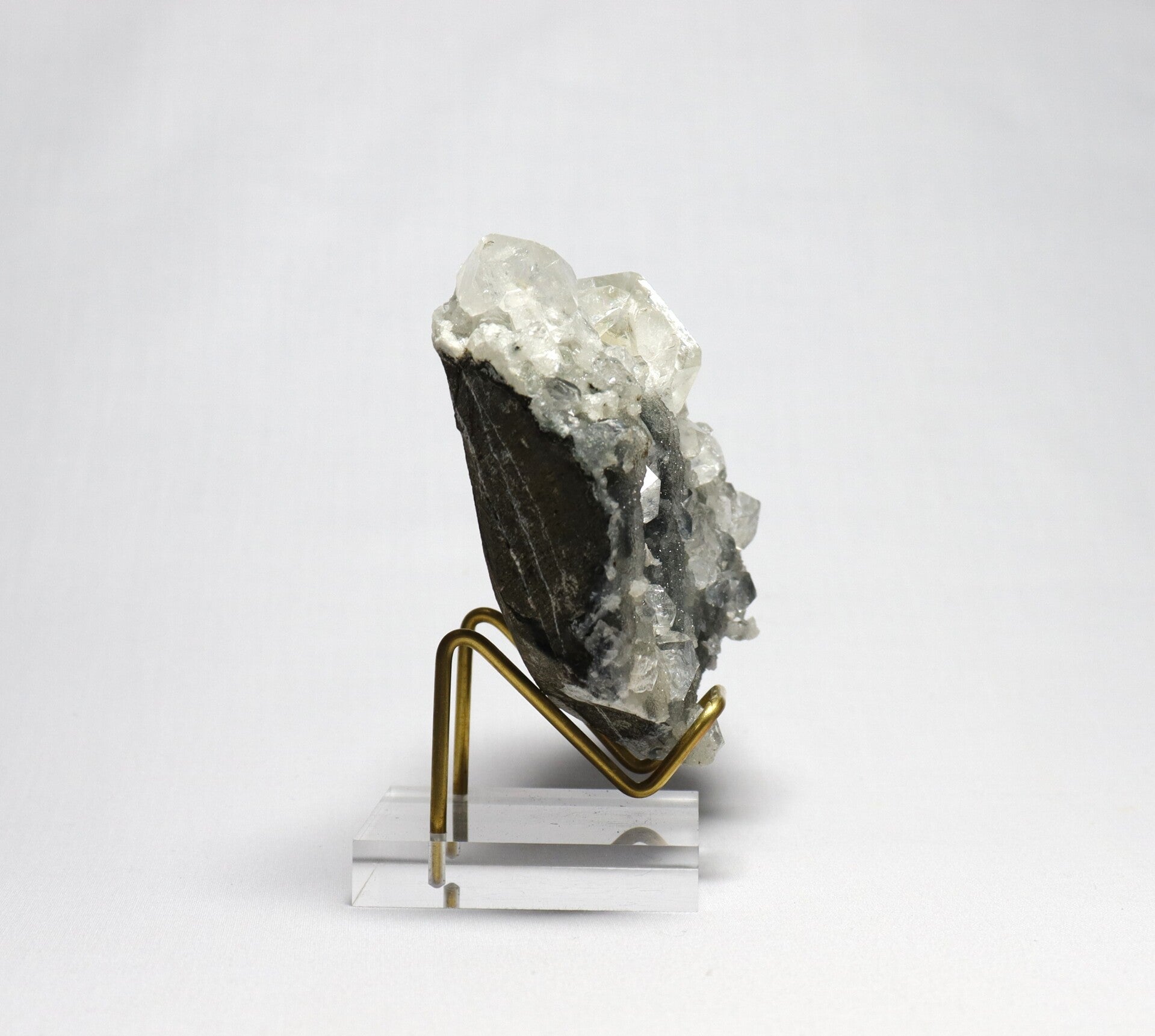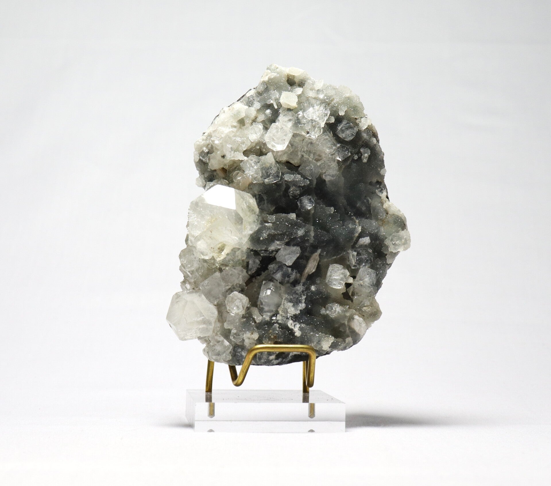Afkomst: Dit type combinatie wordt gevonden in het basaltische Deccan Traps-gebied rond Nashik in Maharashtra, India. De regio staat bekend om haar geodes en holtes in basalt waarin mineralen zoals chalcedoon, apofylliet, stilbiet en andere zeolieten kunnen kristalliseren.