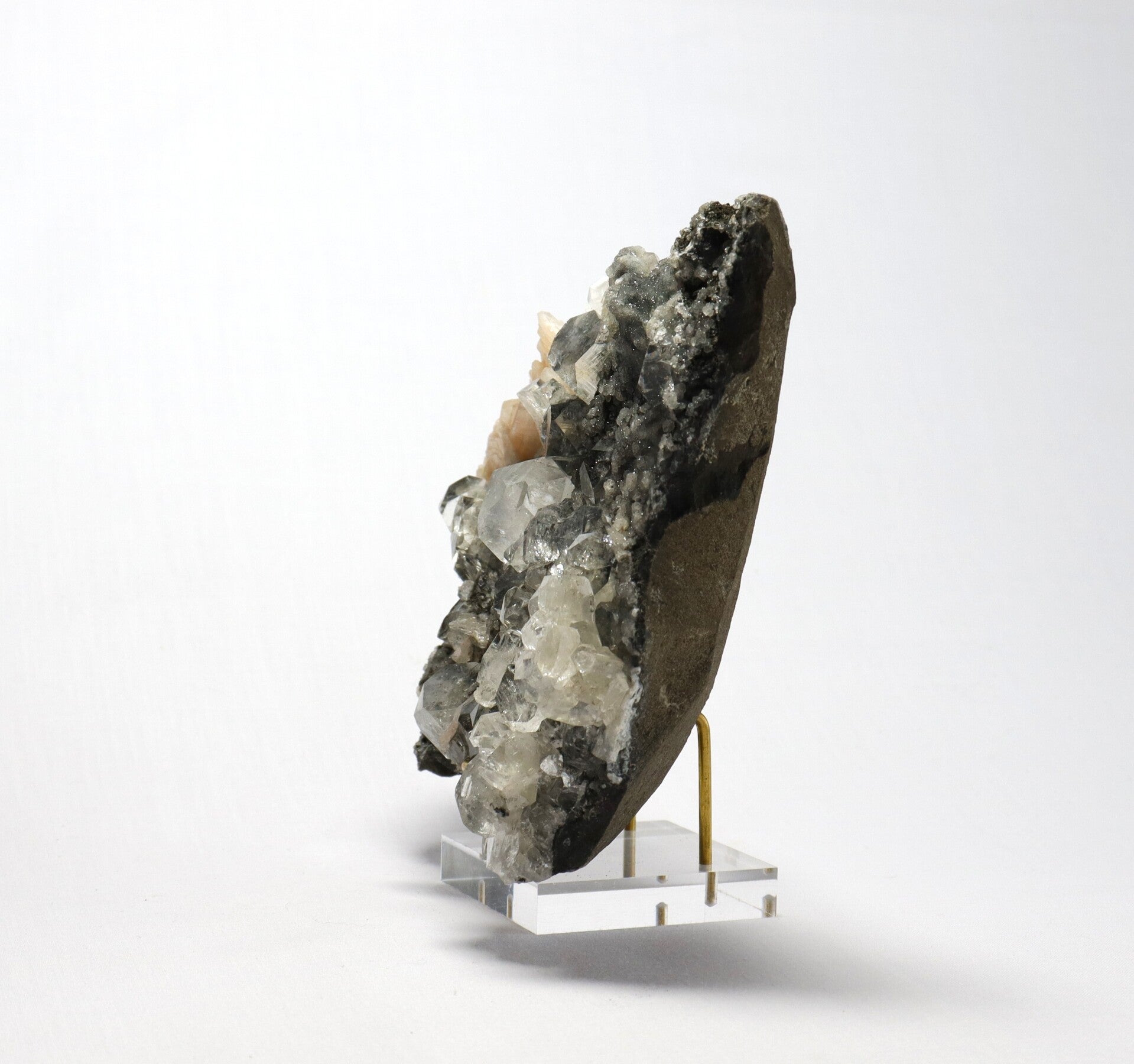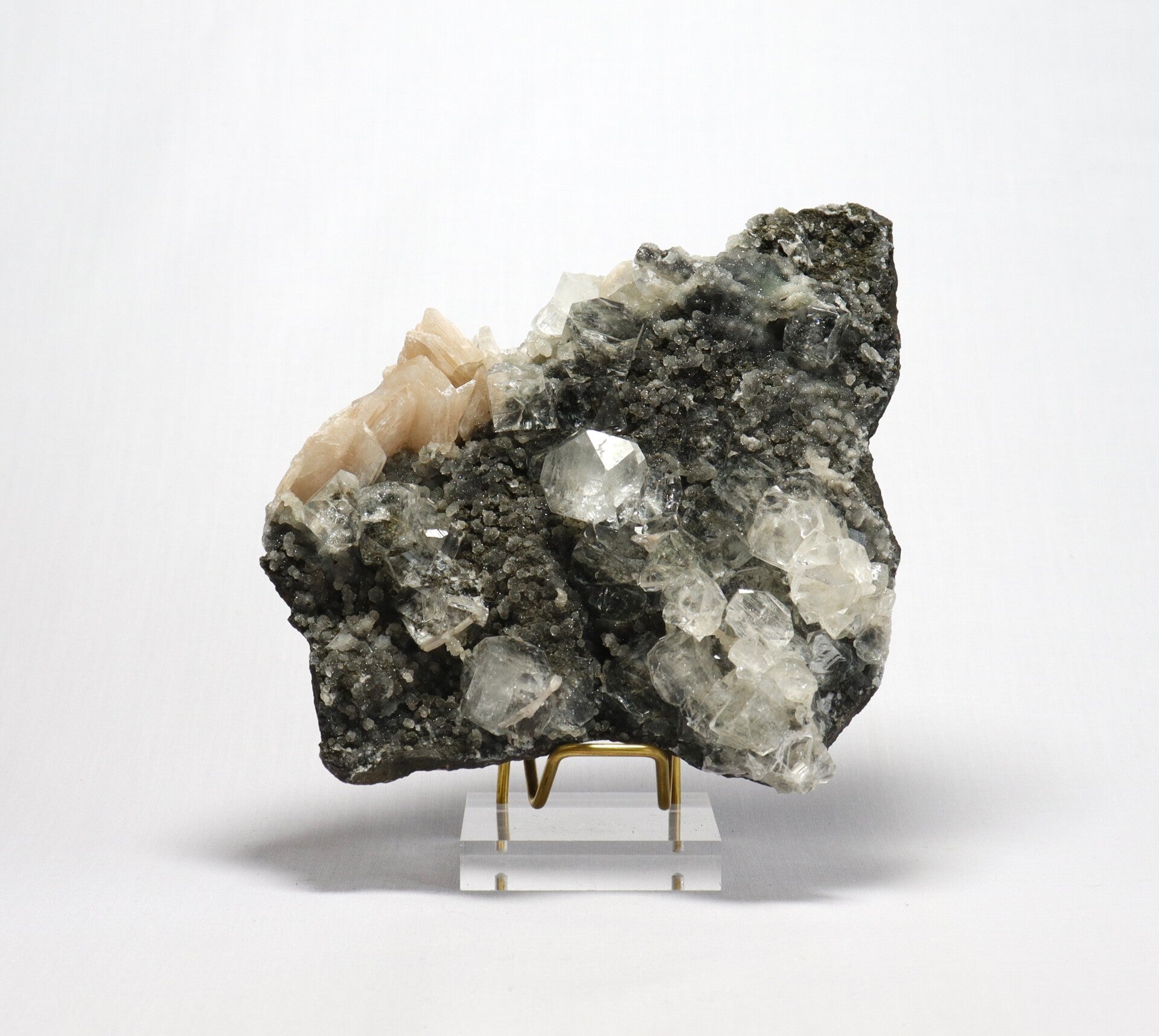 Zwarte chalcedoon met apofylliet en oranje stilbiet is een mooie contrasterende mineraalcombinatie met donkere chalcedoon als basis en daarop heldere apofyllietkristallen en waaiervormige oranje/roze stilbiet.